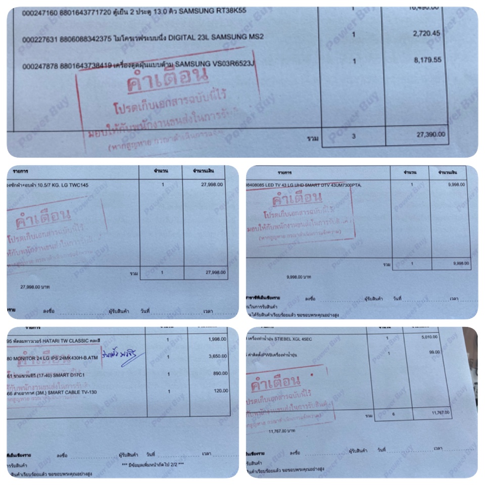 เมื่อวันที่ 8 ธันวาคม 2562 ดิฉันกับสามี ได้ไปซื้อของ ที่ Power Buy เซ็นทรัล สาขาเชียงราย ดังต่อไปนี้ Monitor, ทีวี, ขาแขวนทีวี, สายอากาศ, ตู้เย็น, เครื่องซักผ้า, พัดลม, ไมโครเวฟเครื่องดูดฝุ่น, เครื่องทำน้ำอุ่น, รวมมูลค่า 83,811.00 นัดส่งของ พร้อมบริการติดตั้ง ในวันที่ 23 ธันวาคม 2562 เวลา 9.00 โมงเช้า