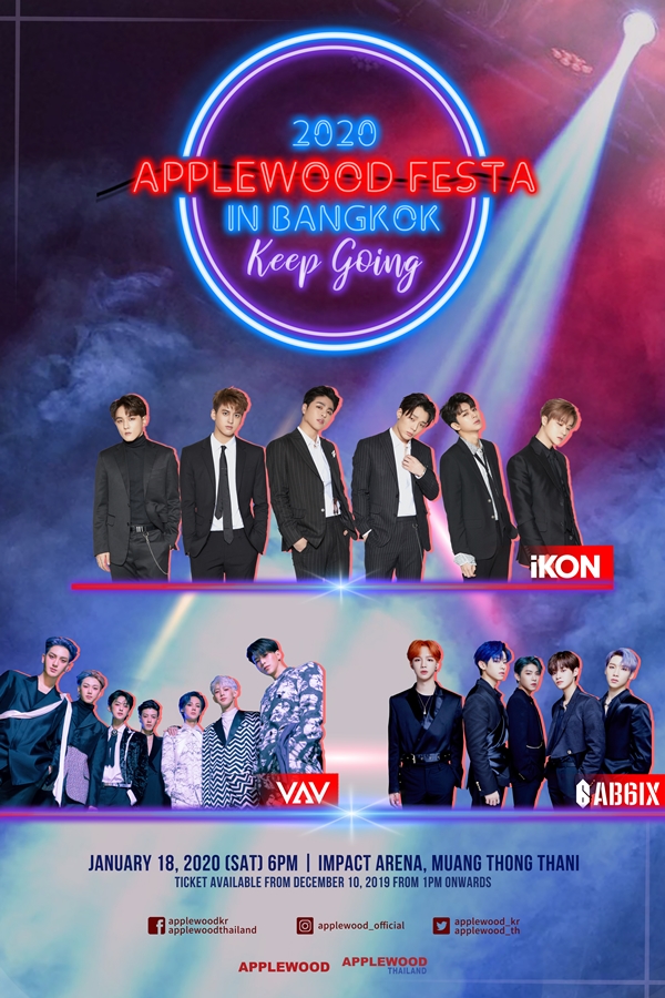 2020 APPLEWOOD FESTA IN BANGKOK : KEEP GOING ที่จะจัดขึ้นในวันเสาร์ที่ 18 มกราคม 2563 เวลาแสดง 18.00 น. ณ อิมแพค อารีน่า เมืองทองธานี บัตรราคา 5,500 บาท /4,800 บาท /3,800 บาท /2,800 บาท /1,800 บาท บนเว็บไซต์ www.allticket.com หรือ 7-11 ทุกสาขาทั่วประเทศ มาร่วมเป็นส่วนหนึ่งของความสุขในครั้งนี้กันนะ!