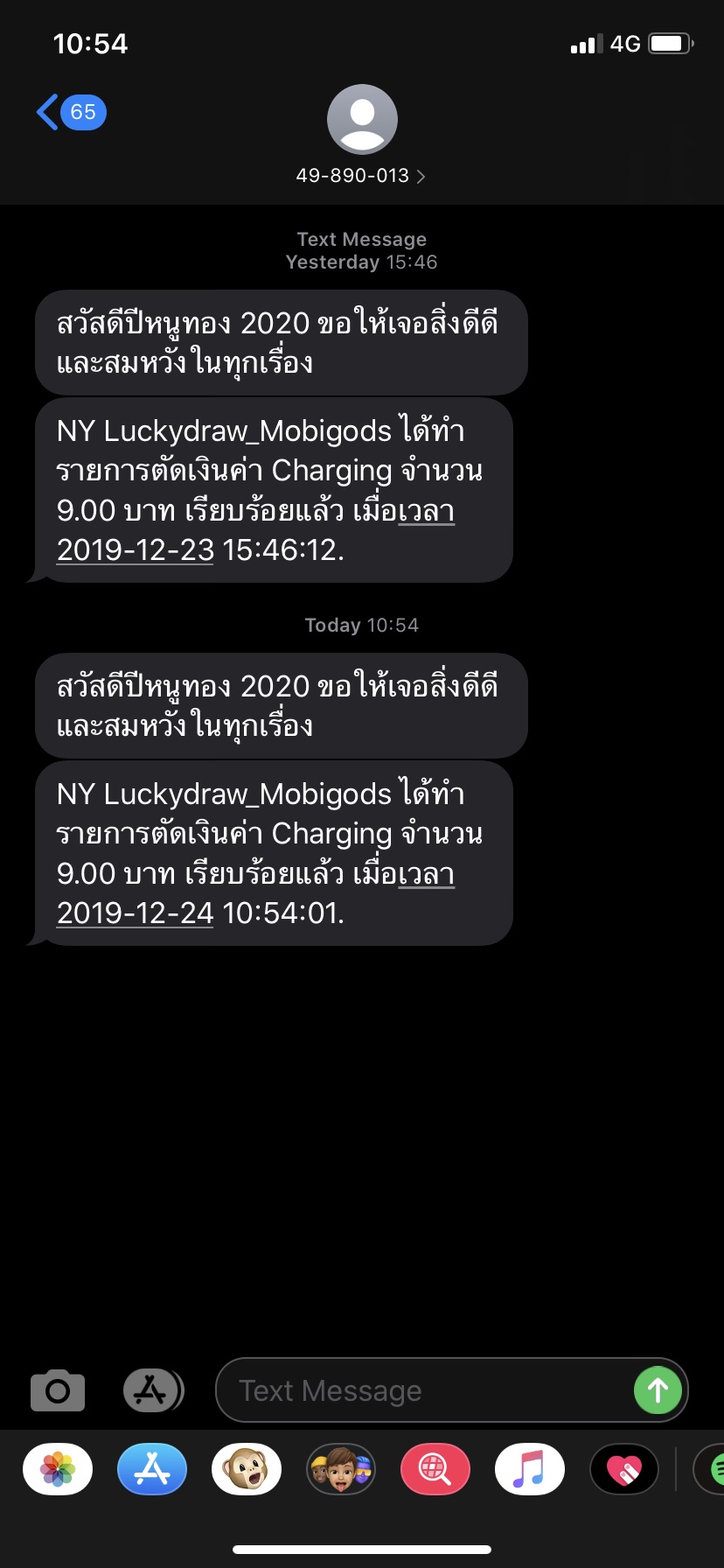จู่ๆมีข้อความส่งมาอวยพร "สวัสดีปีหนูทอง 2020 ขอให้เจอสิ่งดีดี และสมหวังในทุกเรื่อง" และได้รับข้อความต่อมาคือ "NY Luckydraw_Mobigods ได้ทำรายการตัดเงินค่า Charging จำนวน 9.00 บาท เรียบร้อยแล้ว เมื่อเวลา 2019-12-23 15:46:12." พร้อมคิดเงิน 9 บาท หลังจากนั้นผมได้โทรติดต่อ 1678 Dtac call center อธิบายเรื่องราวที่เกิดขึ้นให้เจ้าหน้าที่รับทราบ เจ้าหน้าที่ขอโทษ และแจ้งว่าจะทำการบล็อค Sms หรือข้อความต่างๆเหล่านี้ให้ เพื่อไม่ให้ส่งมารบกวนอีก และยินดีที่จะคืนเงินให้ตามจำนวนที่หักไป....ผมถามอีกครั้งว่าเฉพาะเบอร์นี้หรือเปล่า หรือว่าเป็นเบอร์อื่นๆที่จะเป็น SMS ที่รบกวนและหักเงิน เจ้าหน้าที่แจ้งว่าเป็นทุก SMS ที่หักเงิน จะไม่สามารถส่งเข้ามาที่เบอร์ผมได้อีก ยืนยันทำความเข้าใจกันหลายรอบมาก