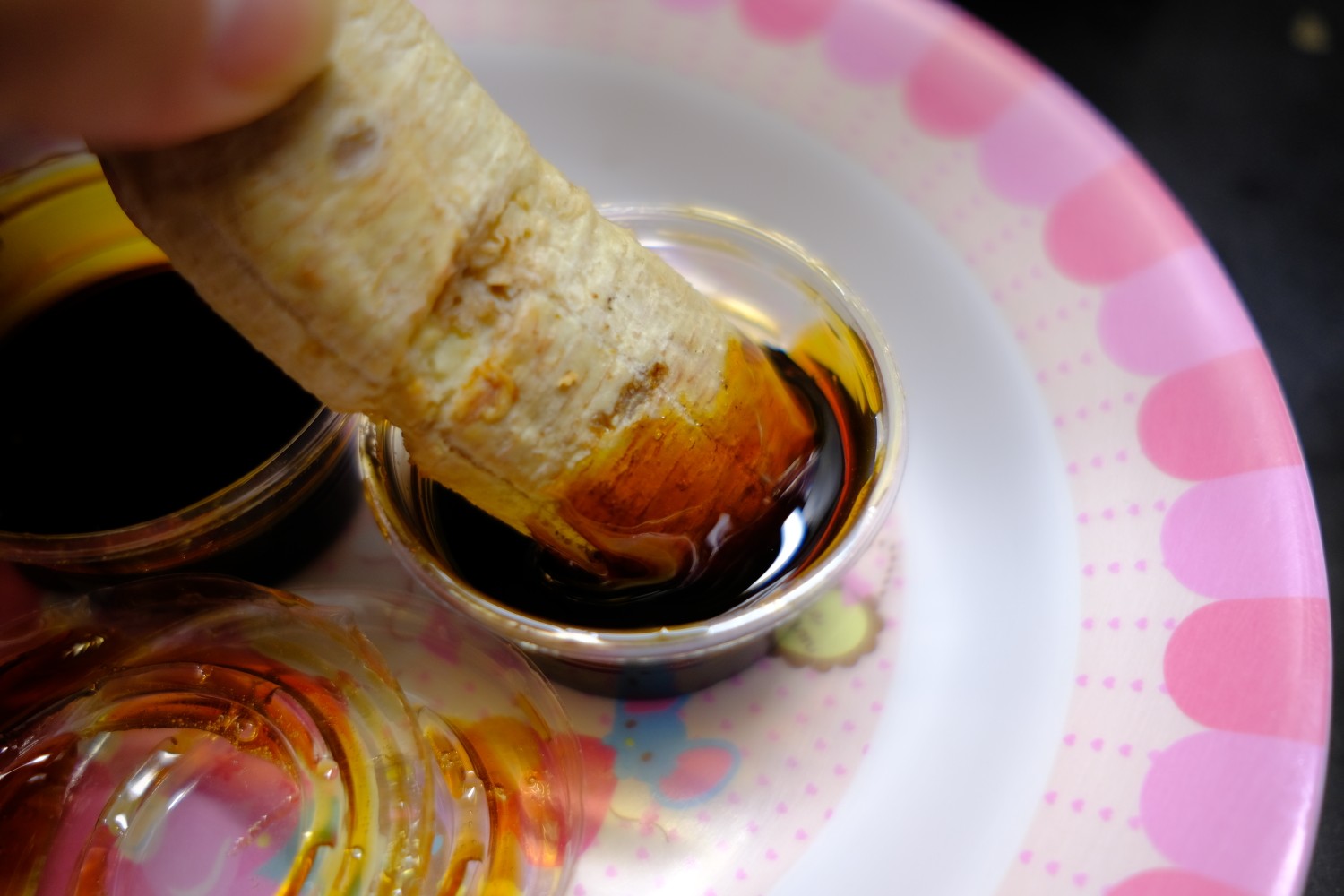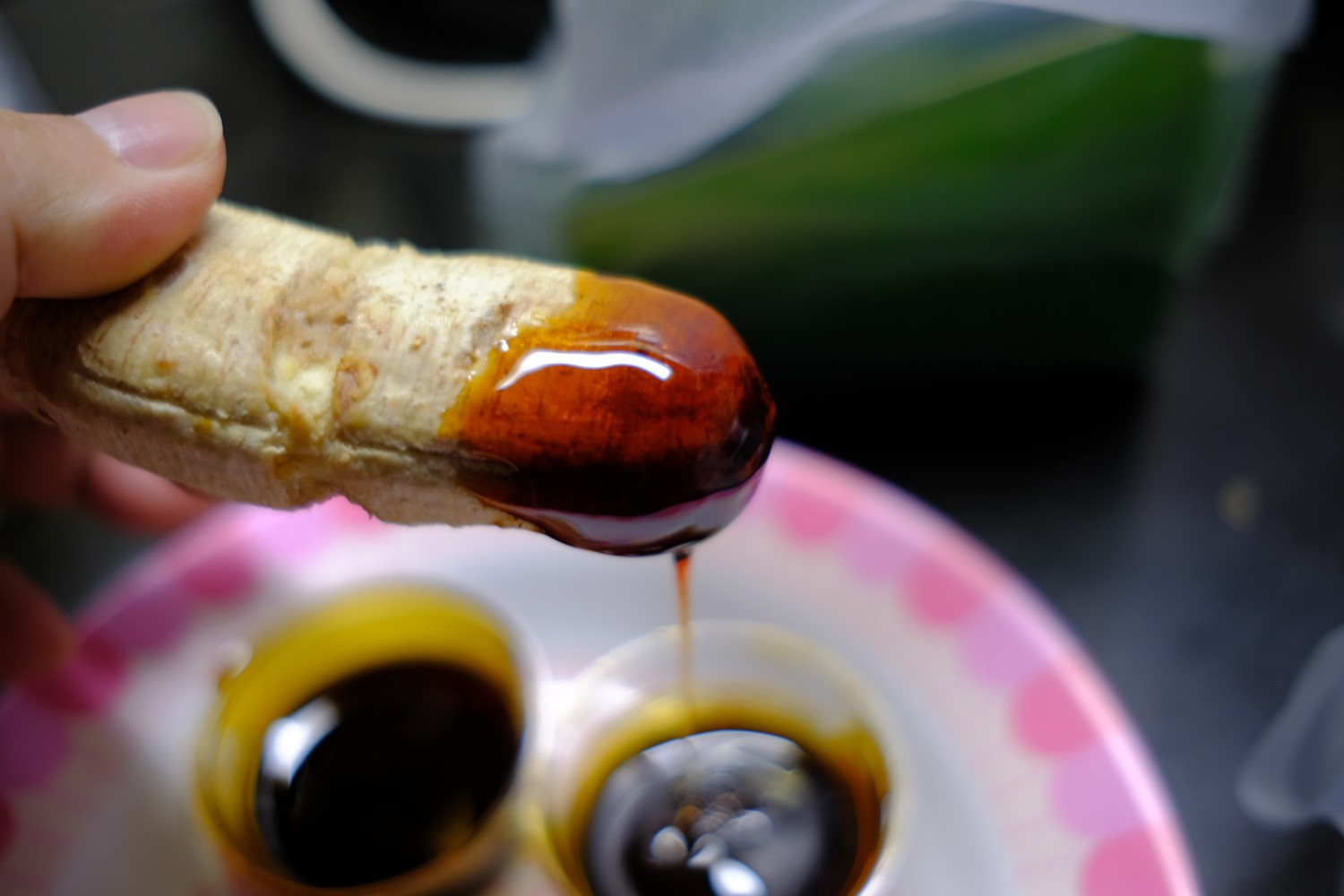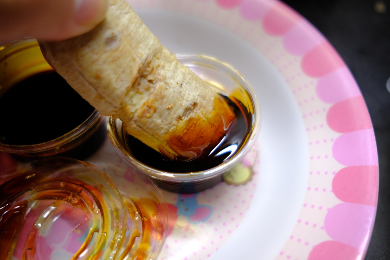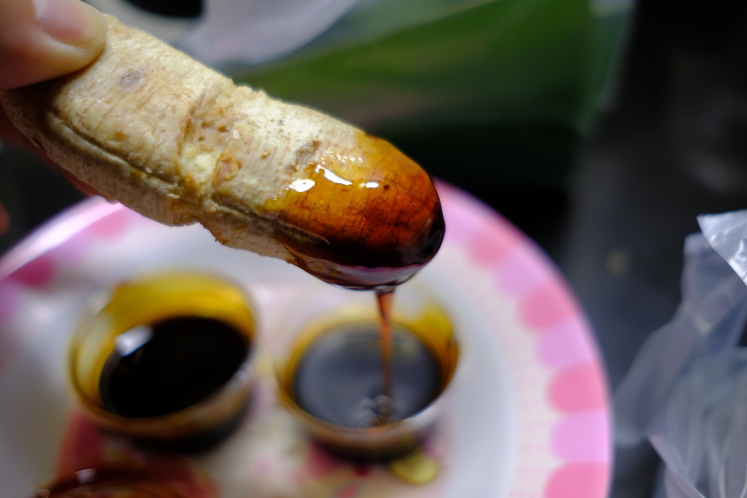 กล้วยทับร้านนี้น้ำจิ้มจะเป็นสีดำๆ ไม่ได้เป็นแบบสีขาวๆ เหมือนกับแบบสมัยใหม่ ร้านนี้เห็นดำๆ แบบนี้จะเรียกว่าหวานเจี๊ยบก็ไม่เชิง เพราะมันไม่ได้หวานเกินไป และจะมีกลิ่นสโม้คเบาๆ และตัวน้ำจิ้มจะเหนียวหนึบ เรียกว่าเอาเข้าปากแล้ว ยังคงสภาพกลิ้งในลิ้นได้