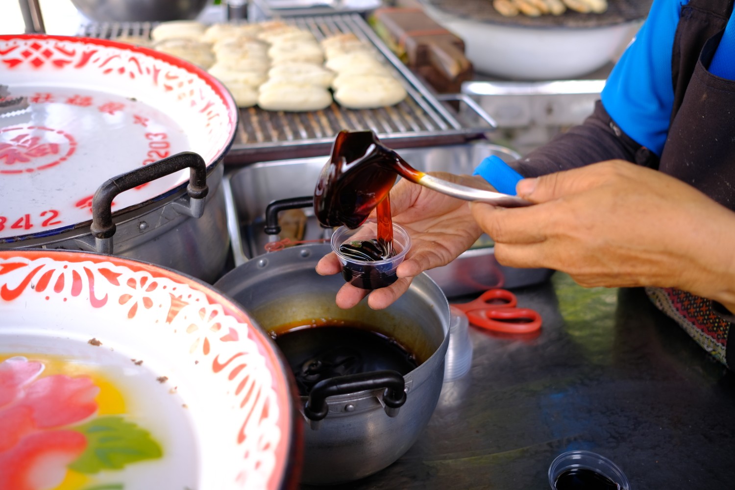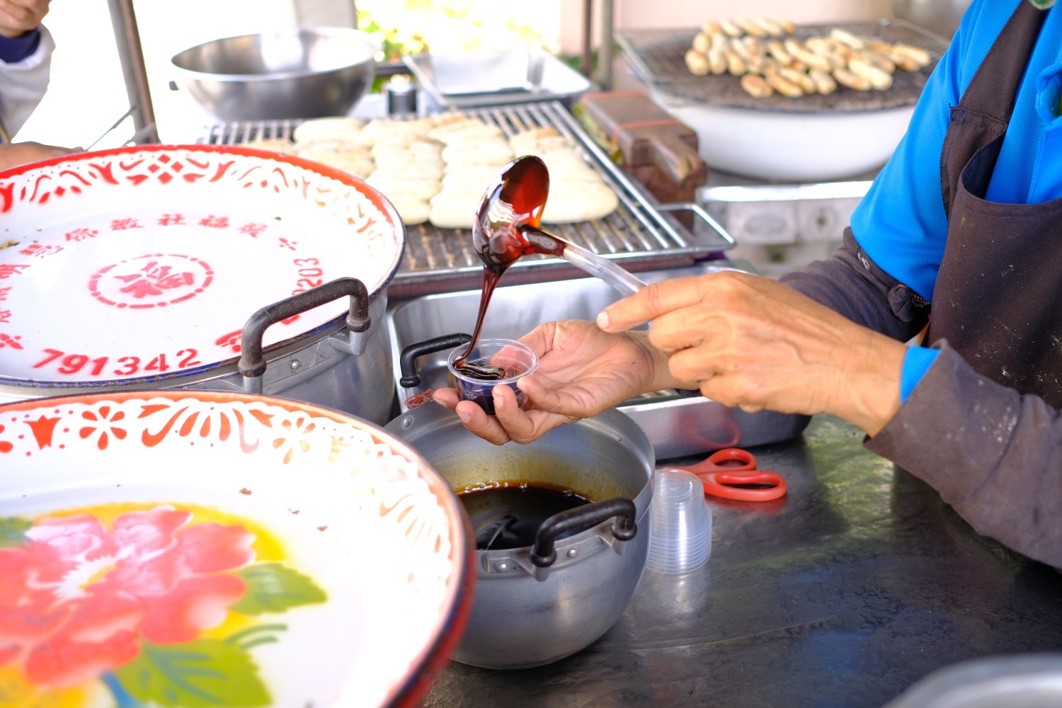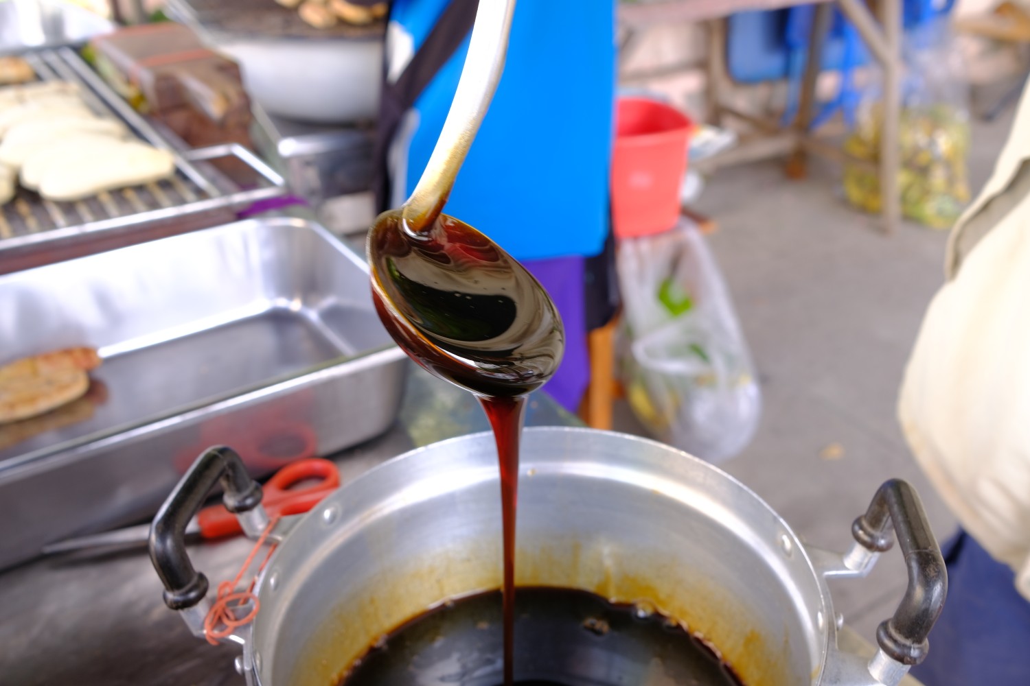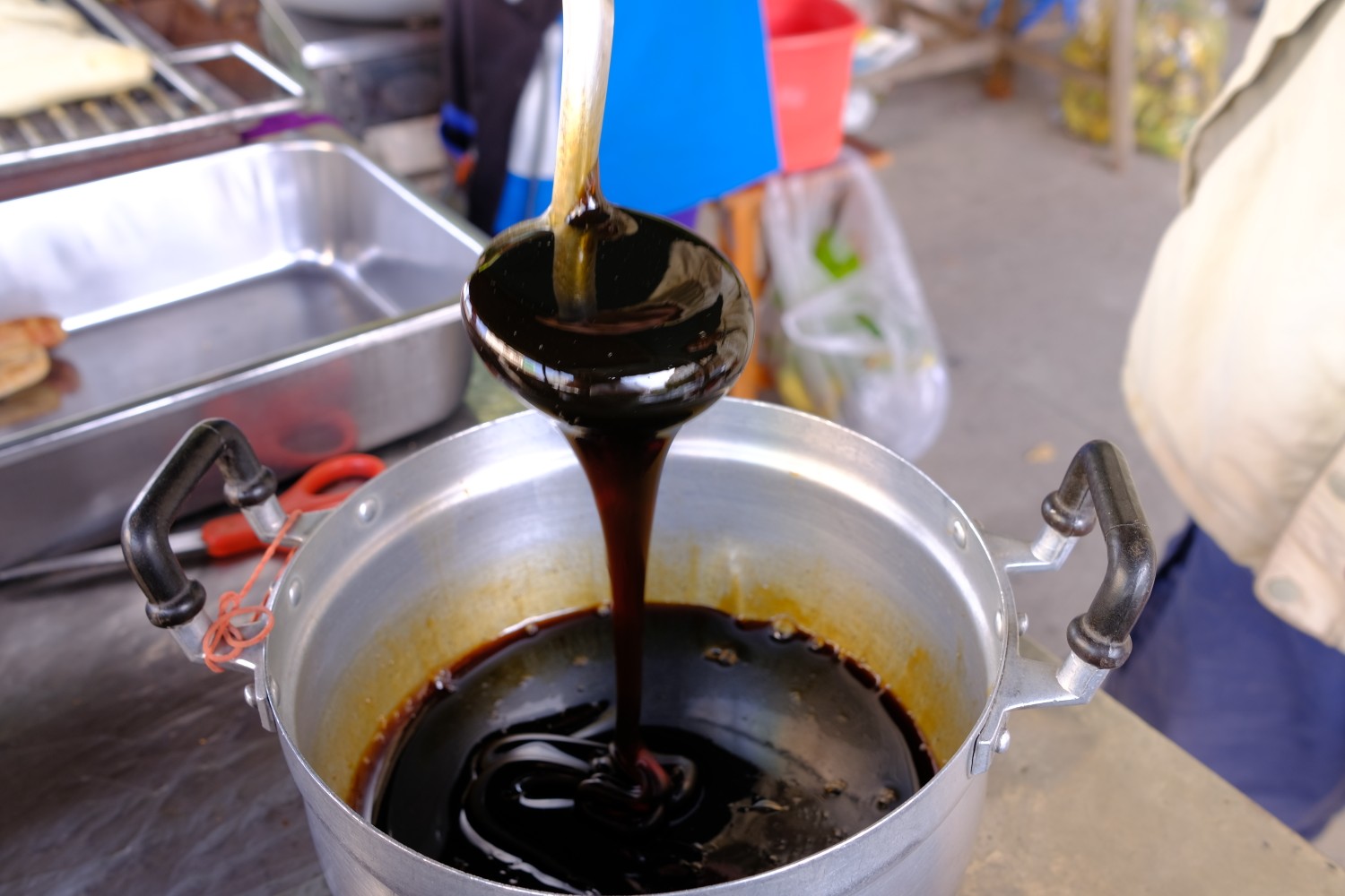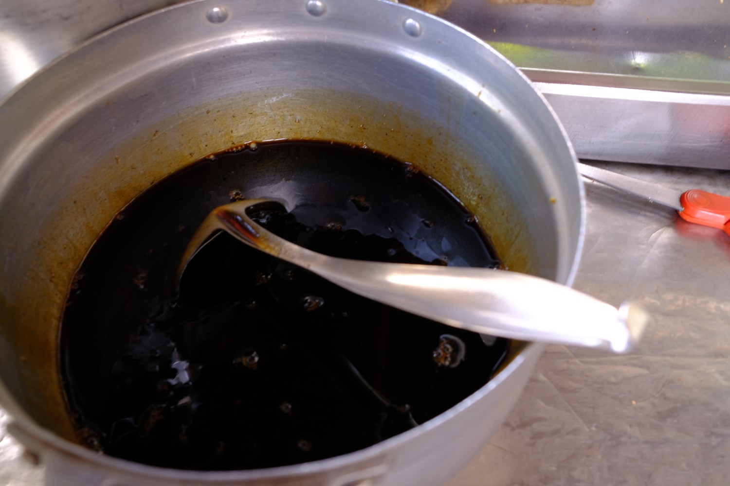 กล้วยทับร้านนี้น้ำจิ้มจะเป็นสีดำๆ ไม่ได้เป็นแบบสีขาวๆ เหมือนกับแบบสมัยใหม่ ร้านนี้เห็นดำๆ แบบนี้จะเรียกว่าหวานเจี๊ยบก็ไม่เชิง เพราะมันไม่ได้หวานเกินไป และจะมีกลิ่นสโม้คเบาๆ และตัวน้ำจิ้มจะเหนียวหนึบ เรียกว่าเอาเข้าปากแล้ว ยังคงสภาพกลิ้งในลิ้นได้