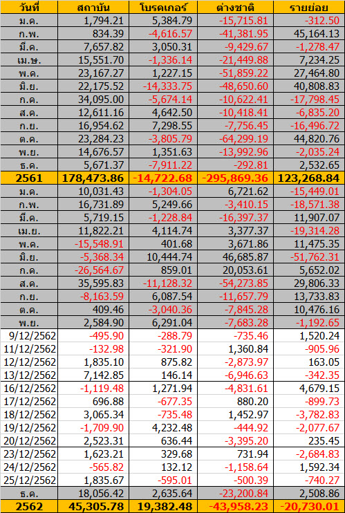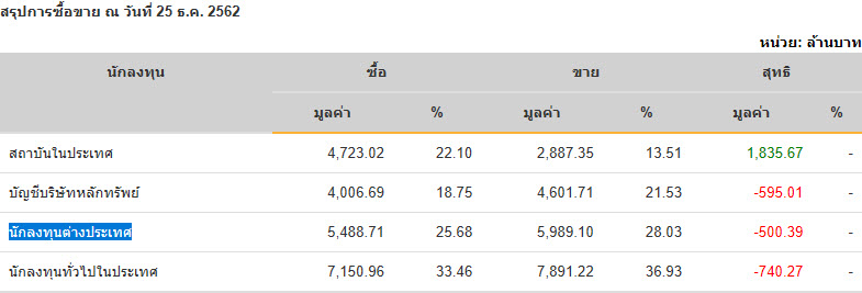 Sinthorn Summary 25/12/2562 : ต่างชาติขายสุทธิ -500.39 ลบ.