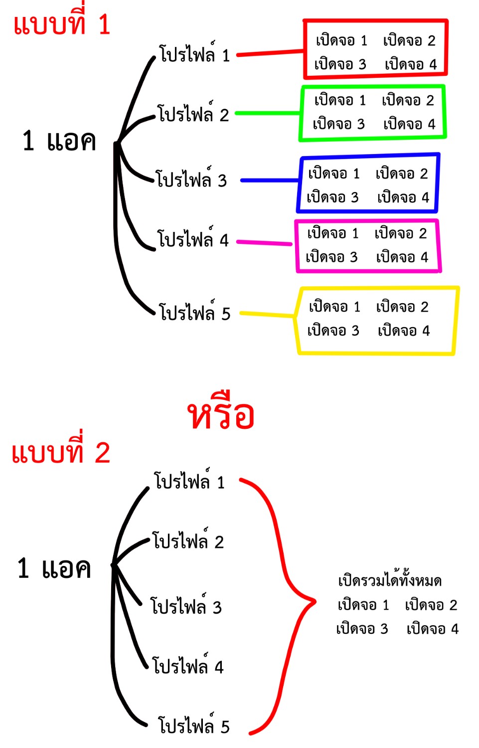 1 acc มี 5 profile ดูได้แต่ละยูเซอ สูงสุด 4 จอ