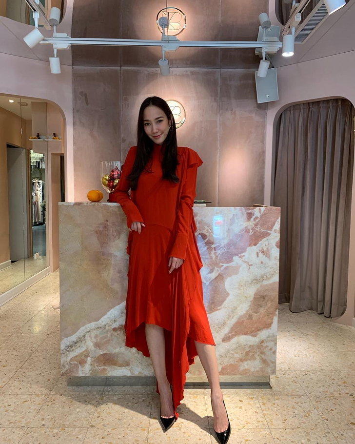 เดรสสีแดงสีเรียบของ อั้ม พัชราภา เป็นอีกหนึ่งตัวเลือกที่ดี ไม่ต้องมีลวดลายเยอะ แต่ดีไซน์เก๋ มีลูกเล่นช่วงชายกระโปรง แมตช์กับรองเท้าสีดำ ปังมากแม่
