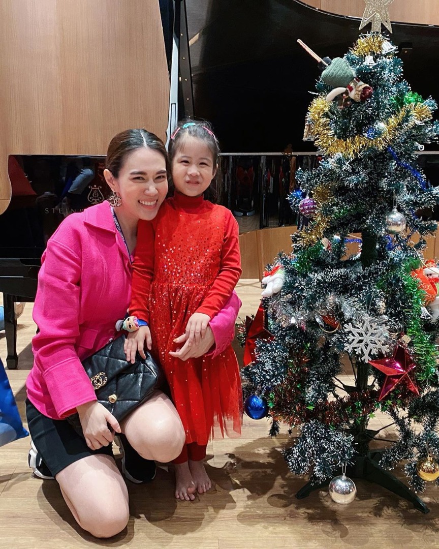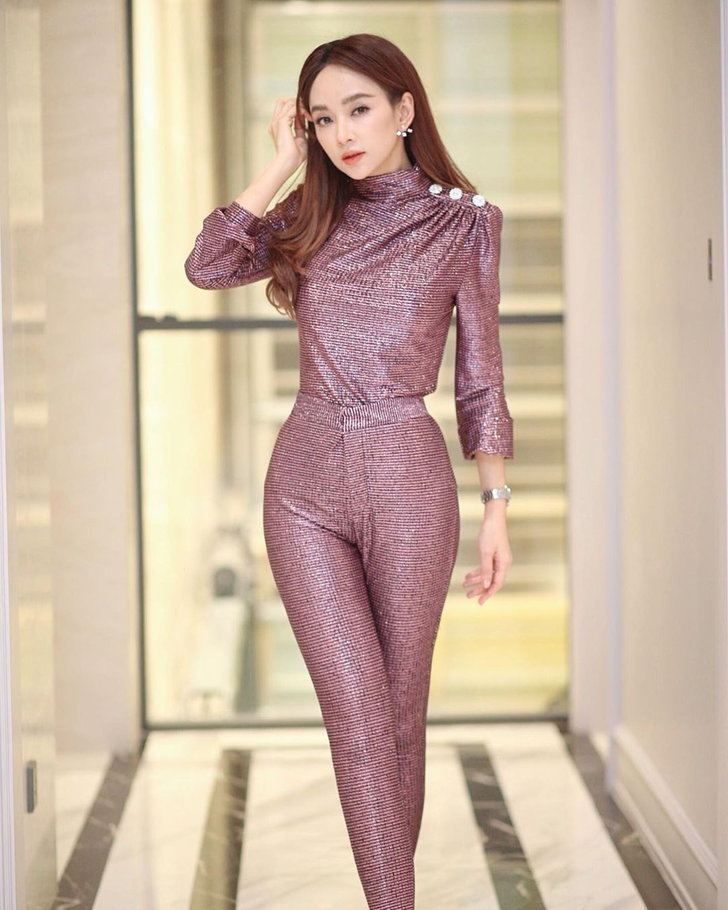 ไม่กล้าแดงสดก็เลือกสีแดงเบอร์กันดี้อย่าง เป้ย ปานวาด คุณแม่ลูกสองกับชุดลายเดียวกันทั้งท่อนบนและท่อนล่าง ดูสวยเก๋ ใครผ่านไปผ่านมาเป็นต้องเหลียวแน่นอนค่ะ