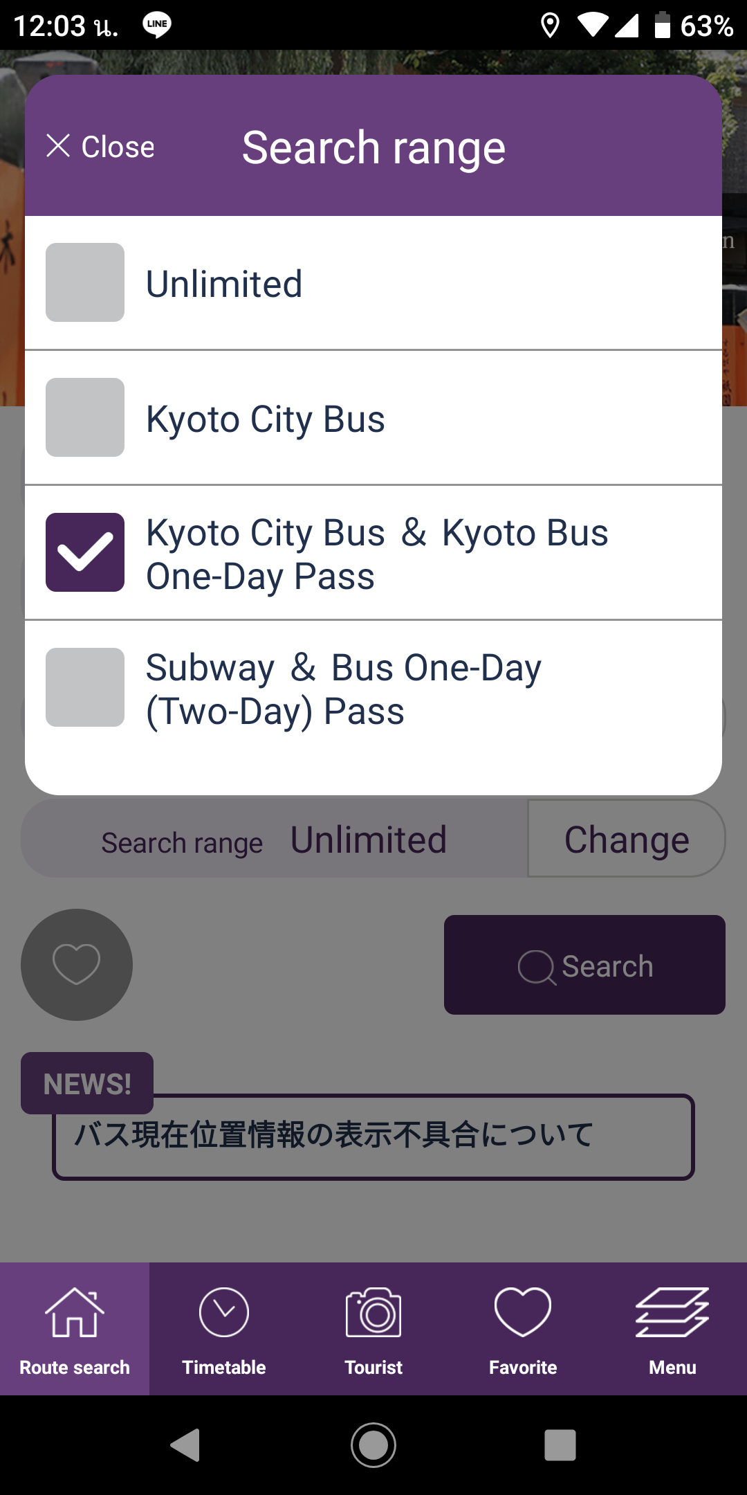 3. แต่พอหาเส้นทางผ่าน app Arukumachi (เลือกพาสแล้ว) แต่ไม่มีบัสสายดังกล่าวขึ้นมาเลย