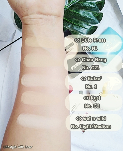 เราสวอชสีให้ดูกันชัดๆ ว่าแต่ละแบรนด์เค้าเนื้อแป้งและสีประมาณไหนบ้าง ก็ส่วนใหญ่จะเป็นโทนออกเหลืองนะ (ก็จะใช้ประมาณเบอร์ 2 แหละ) เพราะเราผิวขาวเหลือง ใครที่ผิวใกล้กับเราก็ลองเอาไปเป็นข้อมูลในการตัดสินใจได้นะ เผื่อว่ากำลังสนใจแบรนด์ไหนเป็นพิเศษ