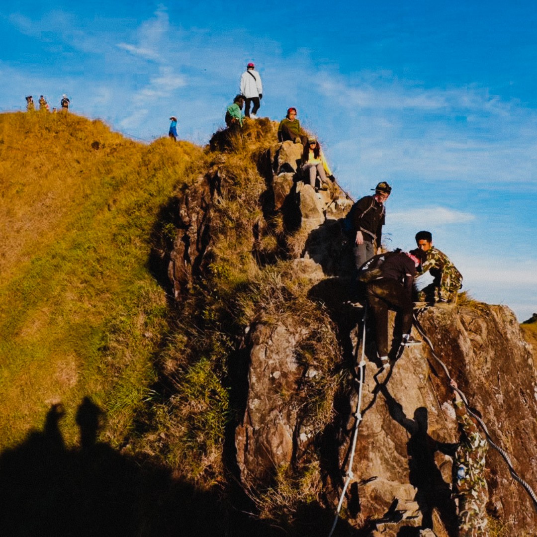 มาถึงนี่แล้ว… จะพลาดเหรอ ไปต่อสิคะ รออะไร บ่าย 3 กว่าๆ ก็ขึ้นไป แน่นอนค่ะ เราก็ไปกรุ๊ปท้ายสุดเหมือนเดิม พี่ทหารก็รั้งท้ายเหมือนเดิม ระหว่างทางที่จะขึ้นไป ค่อนข้างชัน ไม่ 90 องศาไปเลยล่ะ และแล้วก็ถึงสันคมมีด คือ…. มันคือหินขนาดความกว้างไม่เกิน 20 ซม. เป็นทางเดินไป 2 ฝั่งก็คือ เหว นั่นเอง แต่ ณ จุดนี้ พี่ทหารอยู่กันเยอะ ประกบต้นทางและปลายทาง แต่ระหว่างทางก็มีเชือกที่หินไว้ให้จับ อยากยืนนะ แต่มันไม่ได้จริงๆ ได้แต่คลานเข่า ตามฉบับกุลสตรี