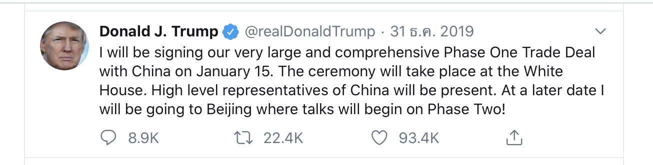 แปลสรุป: ในวันที่ 15 มกราคมนี้ ทรัมป์จะลงนามเซ็นสัญญาการค้าเฟส1ด้วยตนเองที่ทำเนียบขาว และพร้อมจะเดินทางไปเยือนจีนเพื่อเริ่มพูดคุยเรื่องสัญญาการค้าเฟส2ทันที..!!