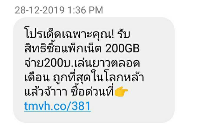 พอดีได้รับ SMS จากทรูส่งมาแบบนี้เกือบทุกวันคะยั้นคะยอให้สมัครแต่คิดว่าใช้ยังไงก็คงไม่ถึง 200GB เลยยังไม่สมัครบวกกับมี wifi บ้านอยู่แล้ว
