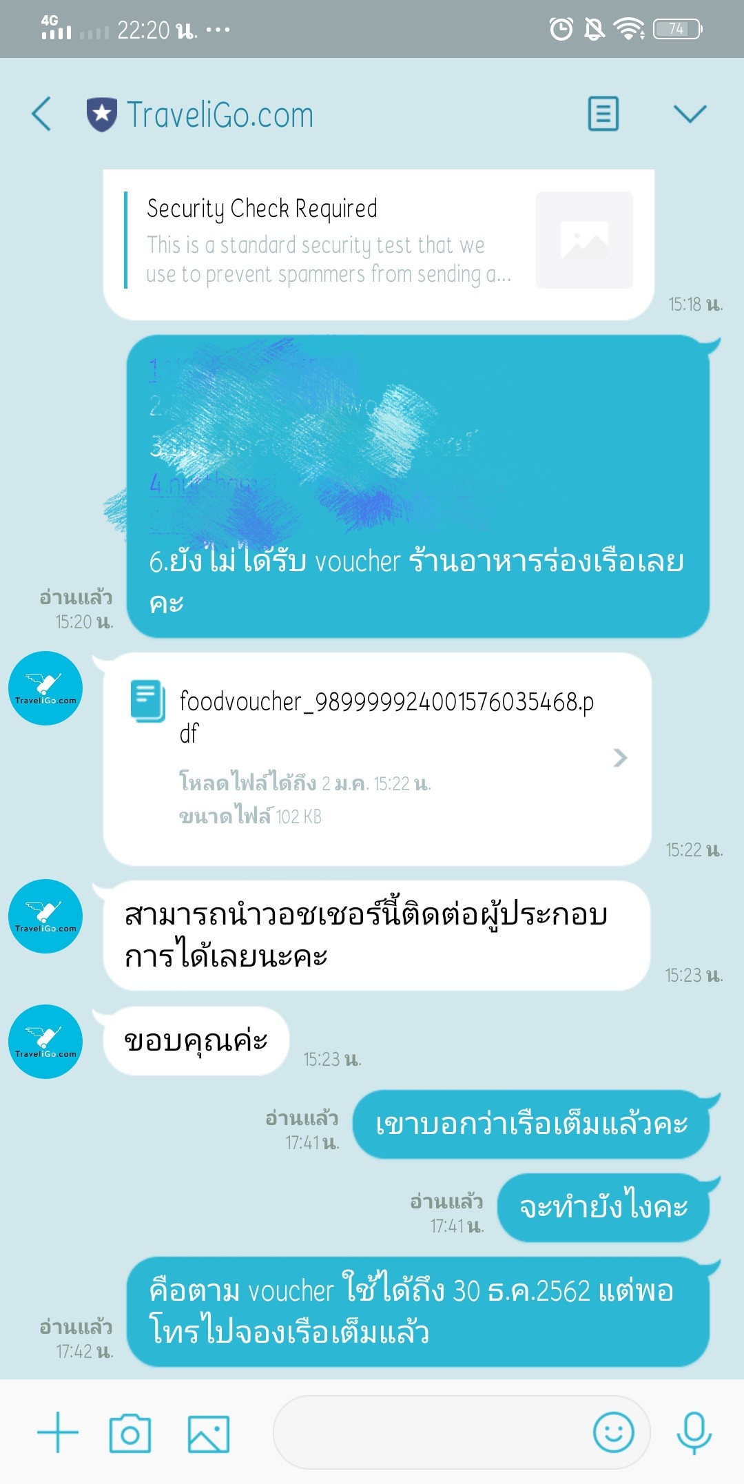 สวัสดีคะเราเป็นคนนึงที่ให้ความสนใจในการลงทะเบียนเที่ยวทั่วไทยจ่ายแค่ 100  เดียว เราเลือกร้านอาหารในกรุงเทพ เลือกแบบล่องเรือ พอลงทะเบียนจ่ายเงินเสร็จเรียบร้อย ทางเว็บแจ้งว่ารอยืนยันผ่านทางe-mail  พร้อม voucher  เรารอหลายวันมากจนต้องติดต่อกลับไปตามเบอร์ที่ส่งSMSผ่านมือถือมาให้ เขาให้เรา@lineและแจ้งปัญหา หลังจากนั้นพนักงานส่งvoucher ให้ เราเลยโทรติดต่อไปจองที่นั่ง พนักงานเเจ้งว่าเต็มแล้ว(พูดจาไม่ดีเท่าไหร่) เราเลยแจ้งปัญหา