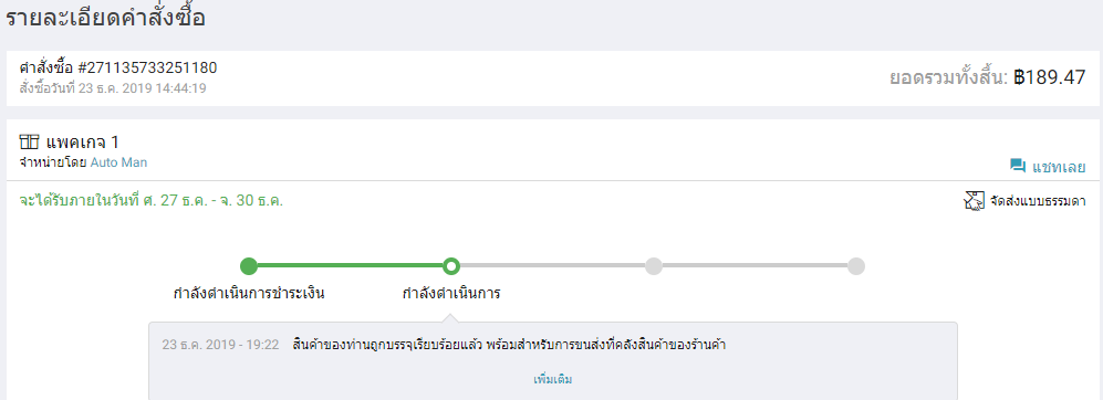ผมเข้าไปดูในเว็ป Lazada และทักแชทกับ Lazada โดยตรง ซึ่งได้คำตอบและข้อมูลที่ไม่ค่อยมีประโยชน์ในการติดตามสินค้าเท่าไหร่ และผมก็ไม่สามารถยกเลิกการสั่งซื้อสินค้าได้