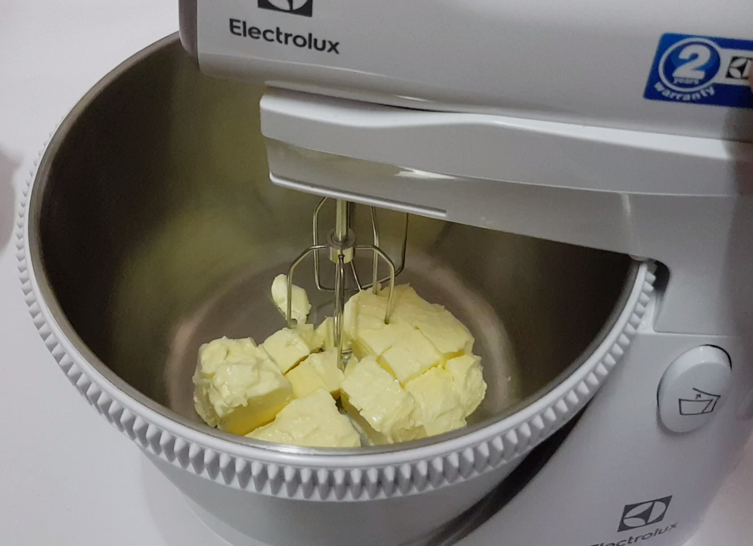 2. ตีเนย ด้วยความเร็วสูง จนขึ้นฟูเบา เป็นสีครีมนวล
