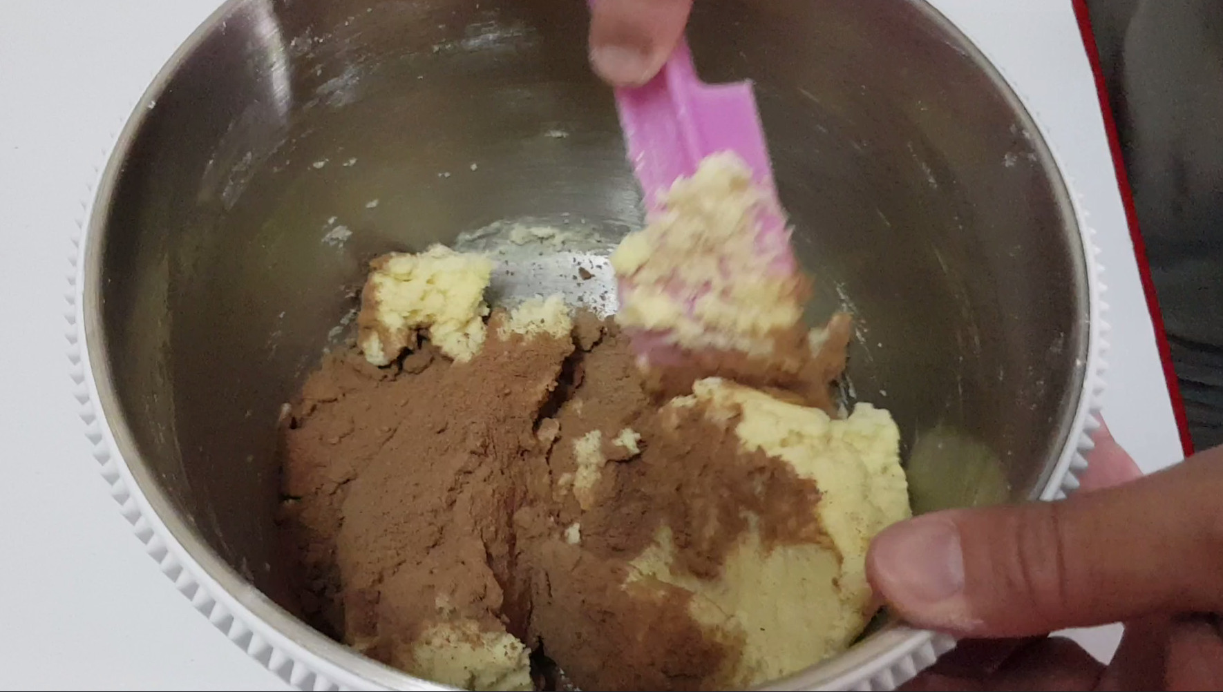 4. ใส่แป้งที่ร่อนไว้ ค่อยๆ แบ่งใส่ 3 ครั้ง ตะล่อมกับเนย ให้พอเข้ากัน