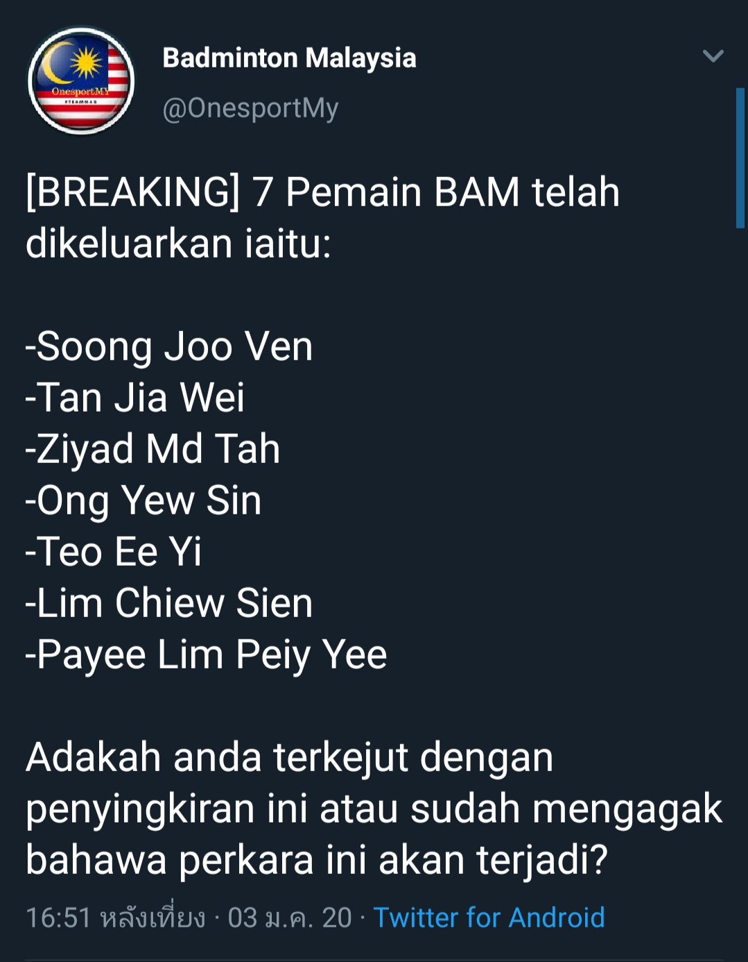 Teo Ee Yi กับ Ong Yew Sin และนักกีฬามาเลเซียอีก 5 คนออกจากทีมชาติ!!!