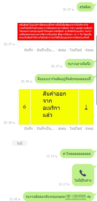 ทั้งไลน์ ทั้งโทรศัพท์ ถ้าใครเคยพรีกับร้านนี้ยังไงรบกวนบอกหน่อยนะคะ