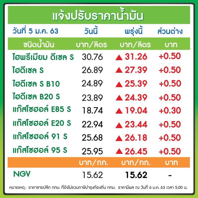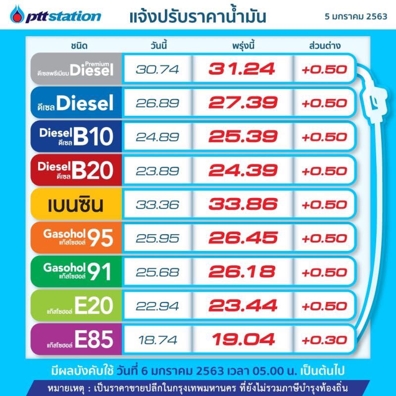 โดยน้ำมันกลุ่มดีเซลทุกชนิด ไม่ว่าจะเป็น พีทีที อัลตร้าฟอร์ซ ดีเซล, พีทีที อัลตร้าฟอร์ซ ดีเซลพรีเมียม, พีทีที อัลตร้าฟอร์ซ ดีเซล B10 และ พีทีที อัลตร้าฟอร์ซ ดีเซล B20 รวมถึงน้ำมันกลุ่มเบนซินและแก๊สโซฮอล์ทุกชนิด ปรับขึ้น 50 สตางค์/ลิตร เว้น E85 ปรับขึ้น 30 สตางค์/ลิตร มีผลวันพรุ่งนี้ (6 ม.ค. 2563) ตั้งแต่เวลาตี 5 เป็นต้นไป