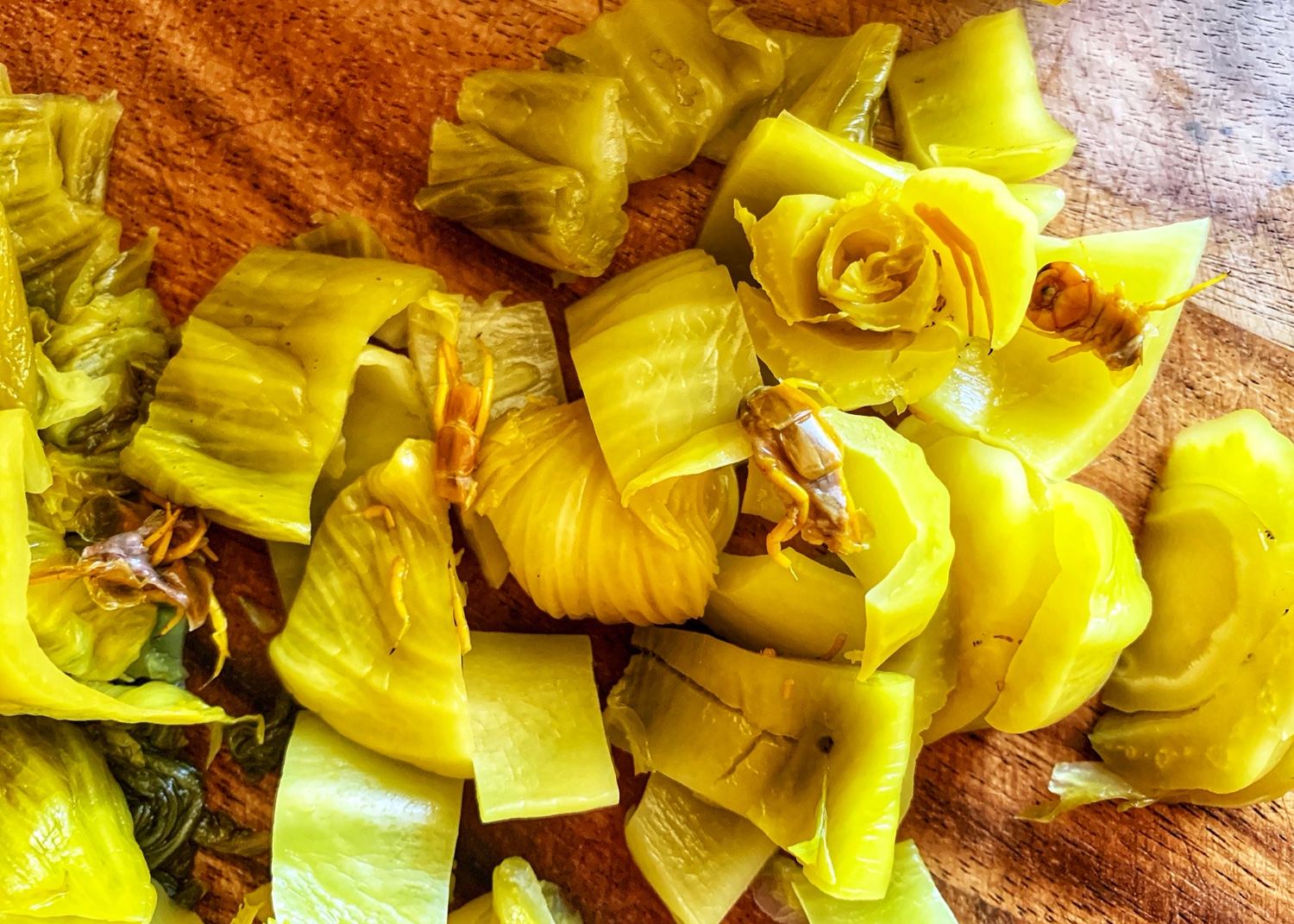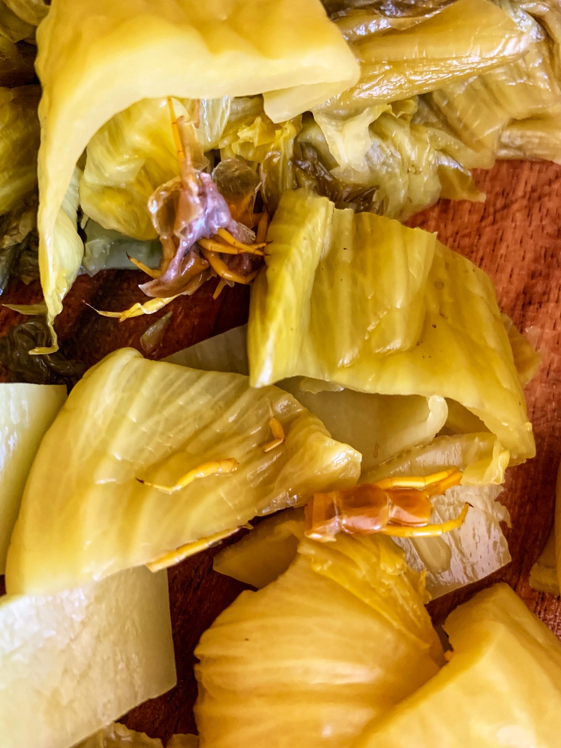 ตอนล้างน้ำทั้งหัวแม้จะล้างทีละใบก็ยังไม่เจอและไม่แม้แต่ล่วงหล่นมาให้เห็นซักตัว ล้างเสร็จบีบน้ำ นำมาหั่นกับเขียงตามขนาดบริโภค และขั้นตอนต่อไปคือนำผักกาดดองที่หั่นแล้วไปล้างน้ำอีกครั้งและแช่ด้วยน้ำร้อน ก่อนนำมาปรุงอาหาร