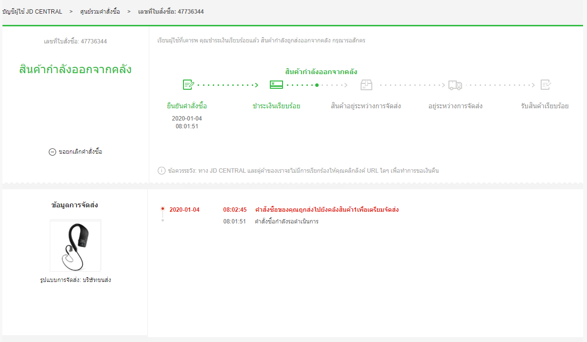ซื้อของหลายอย่างจาก JD Central แล้วส่งเร็วส่งใว แต่รอบนี้ สั่งตั้งแต่วันที่ 4 มกราคม จนตอนนี้ ยังไม่มีความคืบหน้าเลย