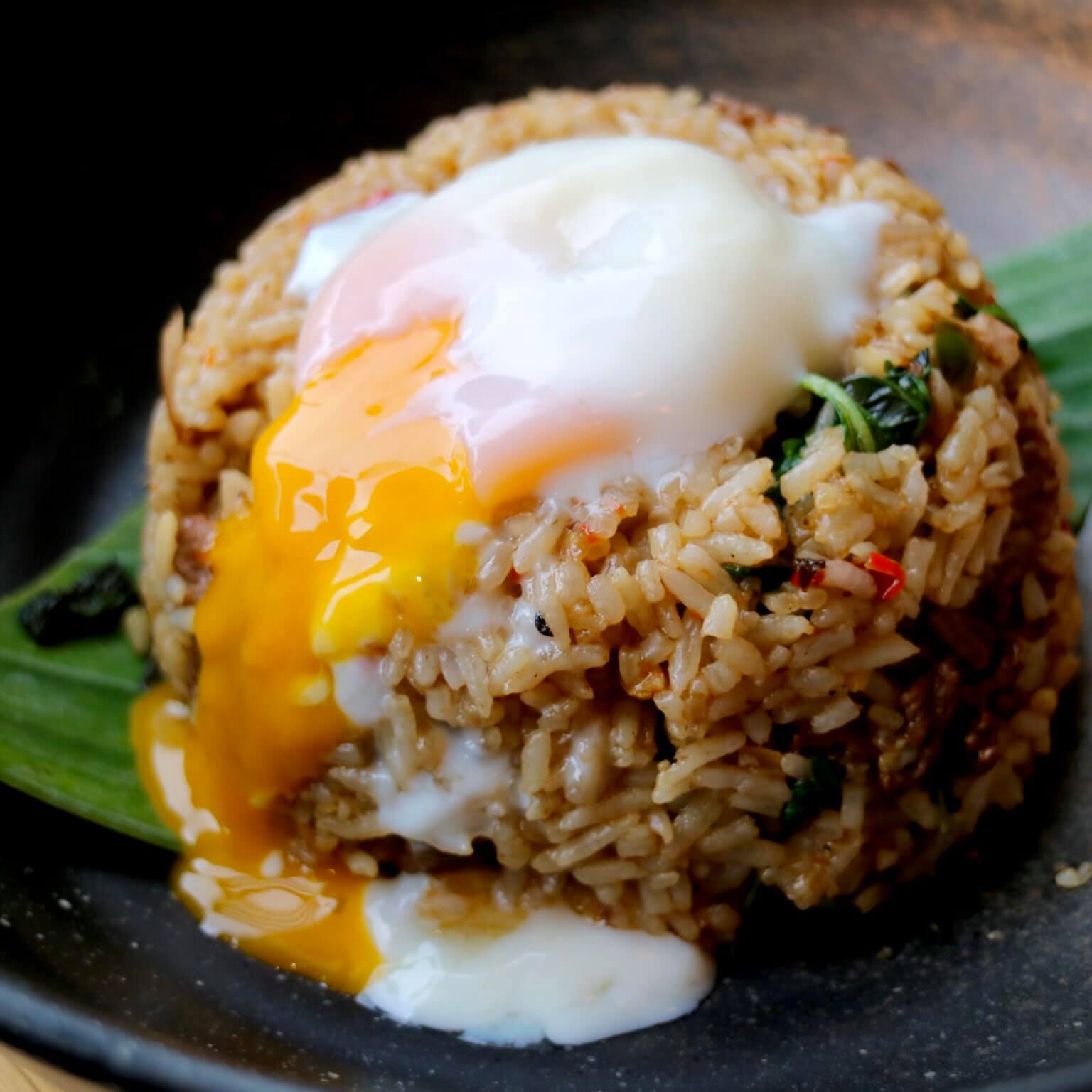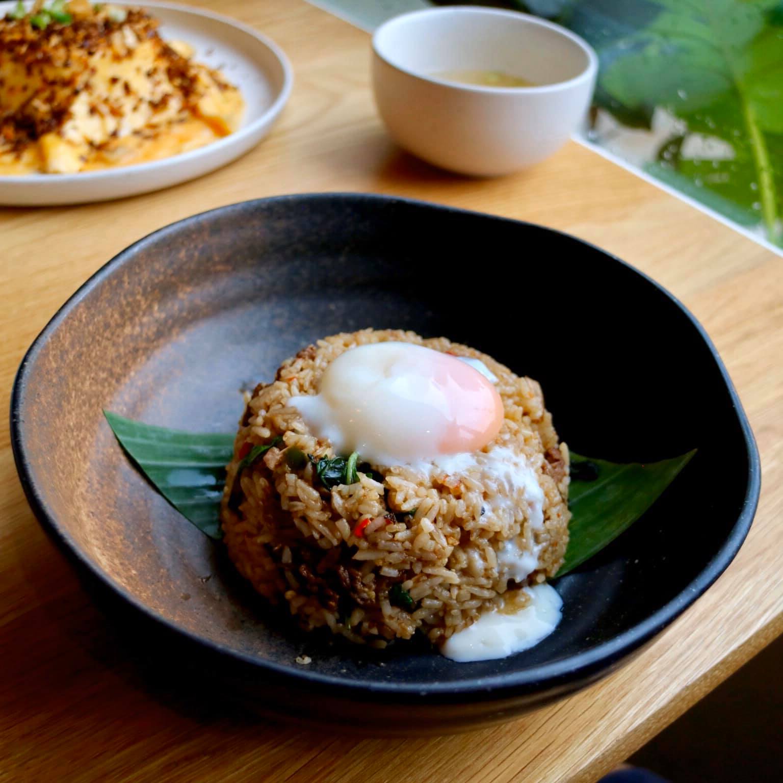 ออนเซ็น” เจาะไข่แดงให้แตกย้อยไปบนข้าวที่คลุกเครื่องกะเพรารสเข้มแต่นุ่มนวลในที ปาดช้อนพร้อมชิ้นวัวเฉือนบางโชยกลิ่นเนื้อหอมคลุมจาน