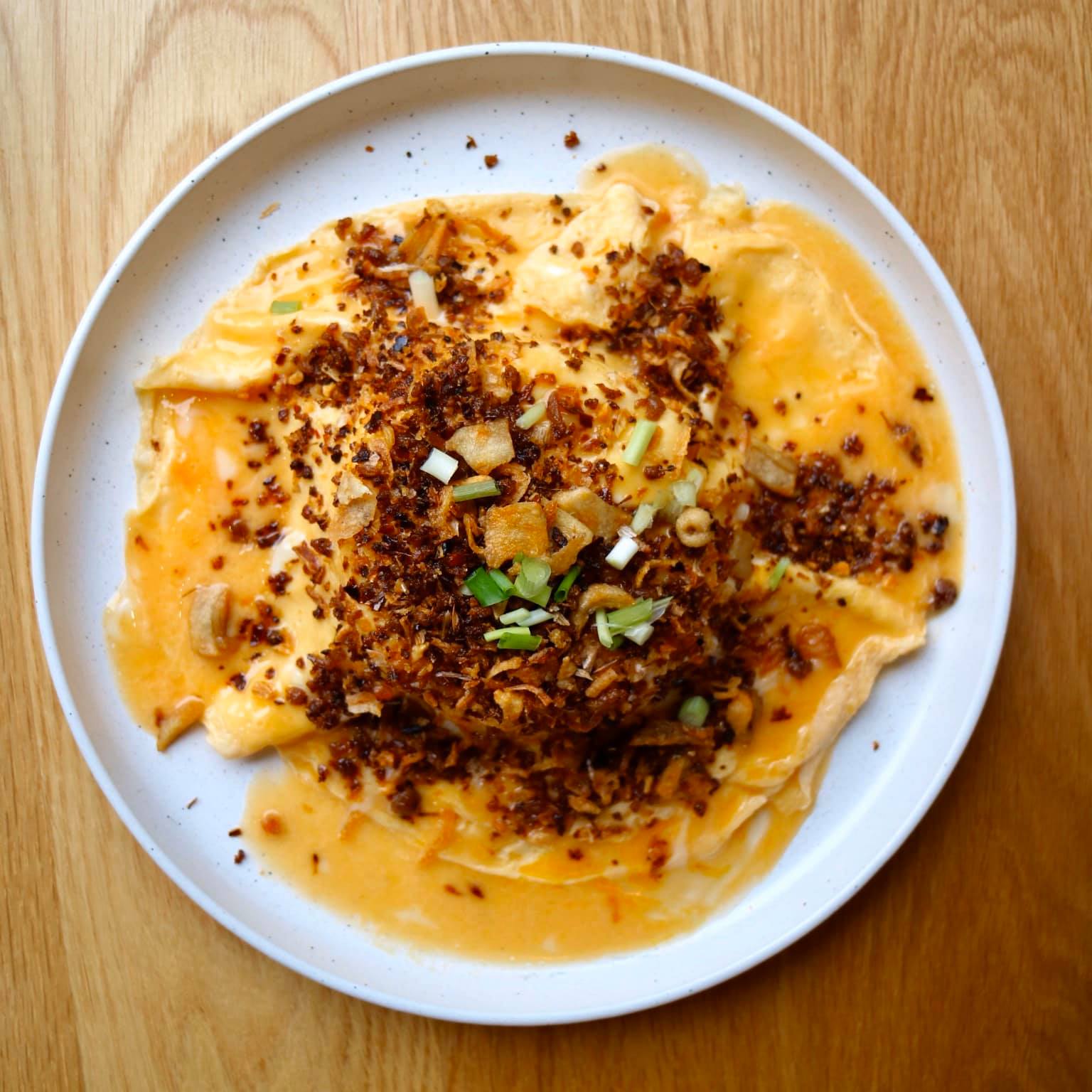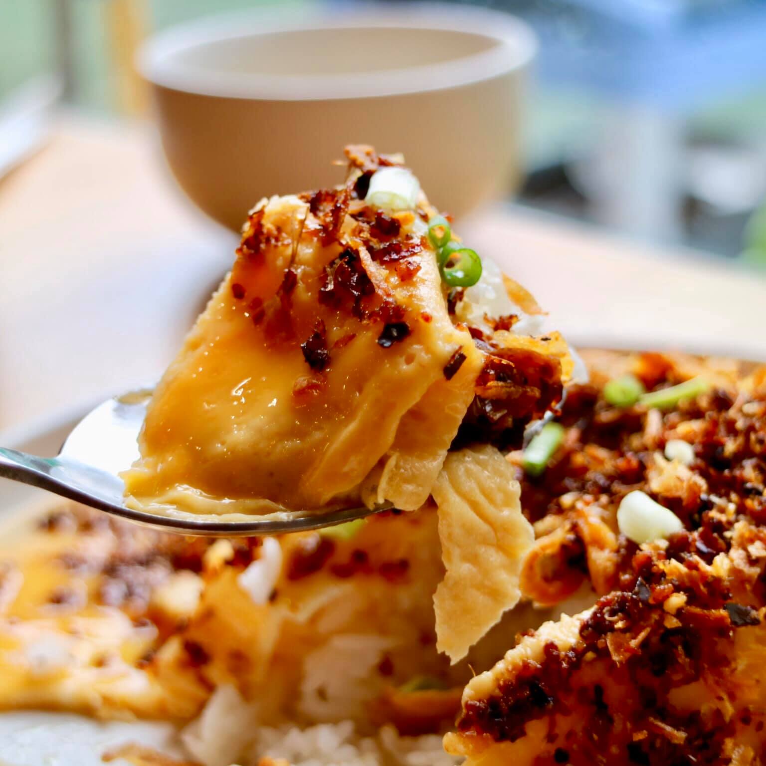 จานของเธอ “ข้าวไข่ข้นหมูคั่วพริก” ไข่ข้นเนื้อนุ่มห่มกองข้าวอุ่นๆ ราดเครื่องหมูสับคั่วเครื่องเทศจนแห้งเข้ม กลิ่นข่าโชยเด็ดจมูก แกล้มด้วยกากหมูเคี้ยวกร้วมๆ จานนี้รสเค็มหวานแซมเผ็ดเบาๆ ไม่โฉ่งฉ่าง