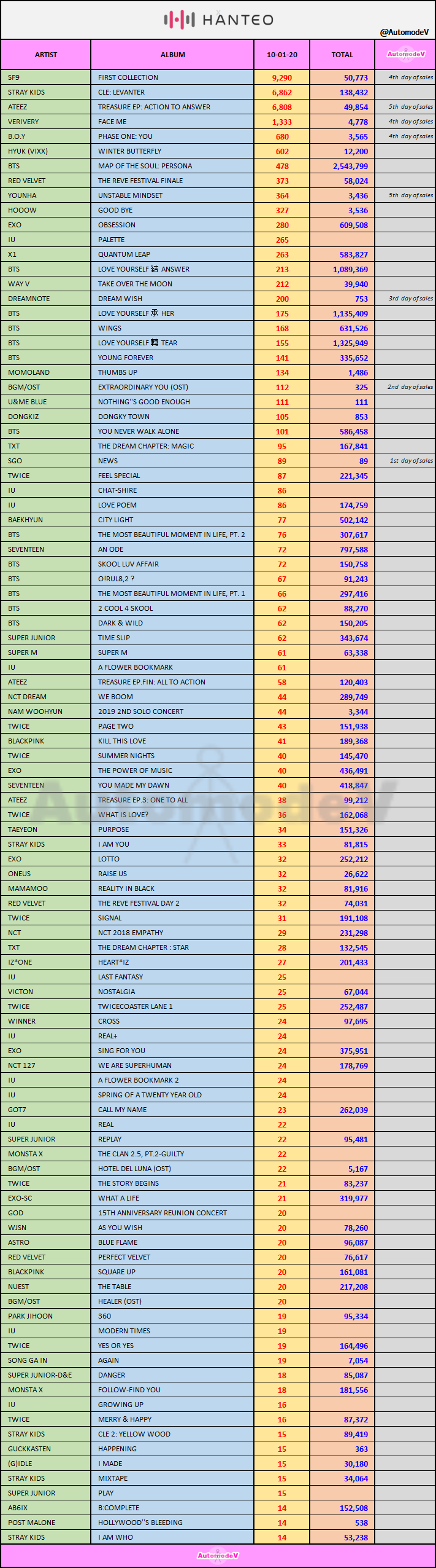 ยอดซื้ออัลบั้มจากชาร์ต HANTEO 10 มกราคม 2563