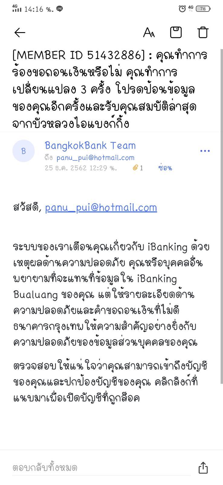 เมลแจ้งจากบัวหลวง i banking ทั้งที่ไม่มีบัญชี