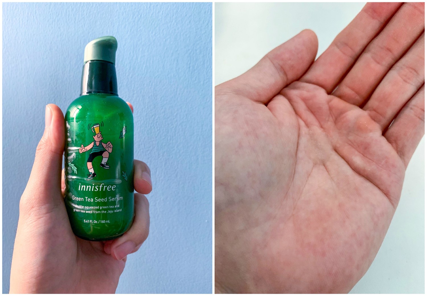 ตัวที่ 3 Innisfree : Green tea Seed Serum หลายคนจะรู้จักว่ามันในชื่อของครีมชาเขียว เพราะกลิ่นน้องเป็นเอกลักษณ์สุด ส่วนตัวชอบกลิ่นของน้องมากหอมสดชื่น ตัวครีมเริ่มเหนียวและเข้มข้นขึ้นมานิดนึง แต่ยังจัดอยู่ในประเภทเซรั่มที่ซึมซาบเร็วเหมือนกัน เซรั่มตัวนี้มีสารสกัดจากชาเขียวเข้มข้นกว่าเซรั่มชาเขียวทั่วไปถึง 3.5 เท่า ช่วยเติมน้ำให้ผิว ฟื้นฟูผิวให้กระจ่างใสและดูสดชื่นขึ้น ราคาตัวนี้ถือว่าไม่แรงมากพอจับต้องกันได้