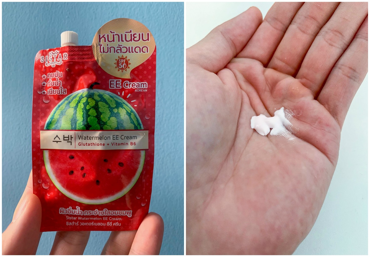 ตัวที่ 5 Sistar Watermelon EE Cream เอาไว้ใช้ตัวสุดท้ายก่อนออกจากบ้าน ส่วนใหญ่จะรู้จักกันในชื่อ “อีอีแตงโม” ตัวครีมแบบ กันแดด กันน้ำ เกลี่ยทาบนใบหน้าง่ายดี ช่วยควบคุมความมันบนใบหน้าพร้อมทำให้หน้าเราเนียนใสวิ้งๆ แบบครีมเดียวจบเลยแหละ เจ้าตัวนี้มีกลิ่นแตงโมอ่อนๆ ตามชื่อเลย เหมาะสำหรับคนที่เคยครีมกันแดดกลิ่นฉุนมา รับรองตัวนี้เด็ดกลิ่นไม่ฉุนสำหรับผิวแพ้ง่ายอย่างเราก็สบายเลยจ้า และที่สำคัญนะตัวครีมปรับผิวได้เนียนดีจริงหน้าไม่วอกนะ ใช้ดีจนอยากได้เพิ่มมาอีกซองแทนครีมกันแดดที่ใช้อยู่เลย