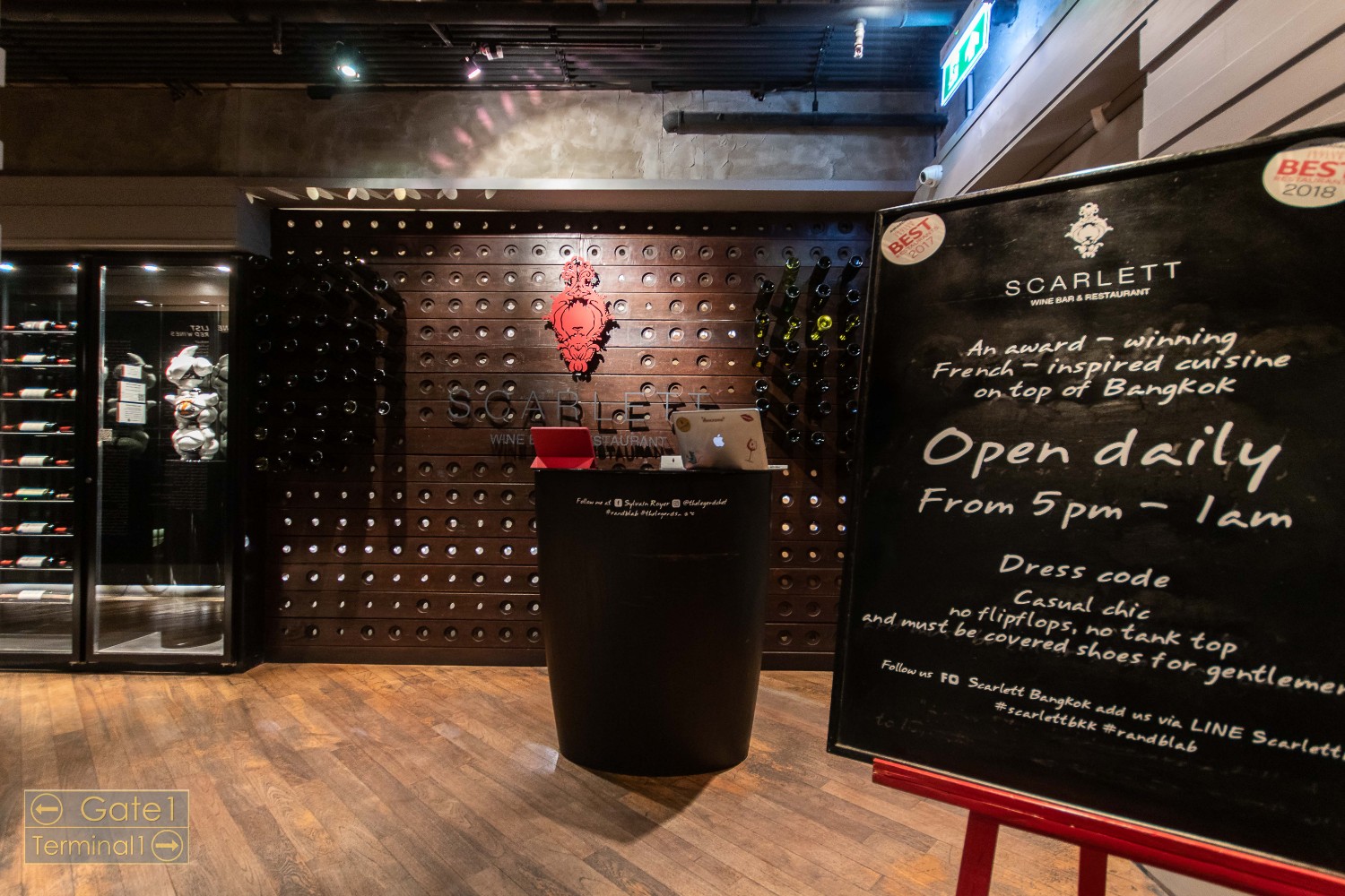 ด้านหน้าของร้านจะมีโต๊ะและพนักงานต้อนรับอยู่ Scarlett wine bar & restaurant เปิดตั้งแต่ 5 โมงเย็นจนถึงตี 1 การแต่งกายออกแนวทันสมัย