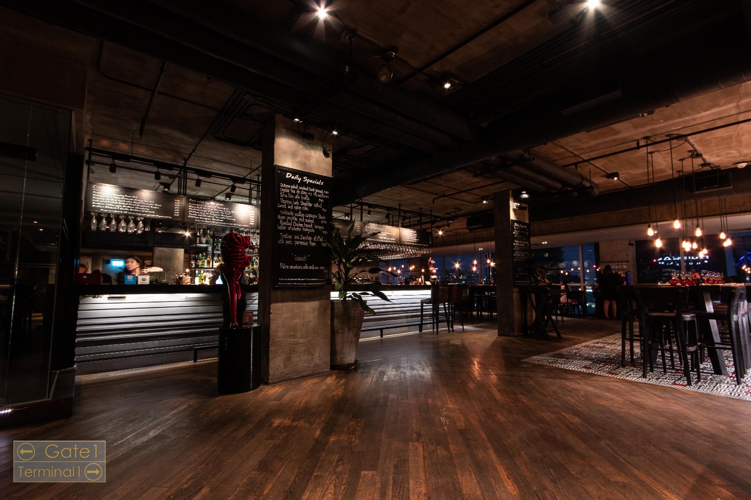 ด้านใน Scarlett wine bar & restaurant ตกแต่งให้อารมณ์ดิบๆพื้นไม้ ปูนเปลือย และท่อบนเพดาน กับแสงสีเหลืองๆแบบหลอดไส้