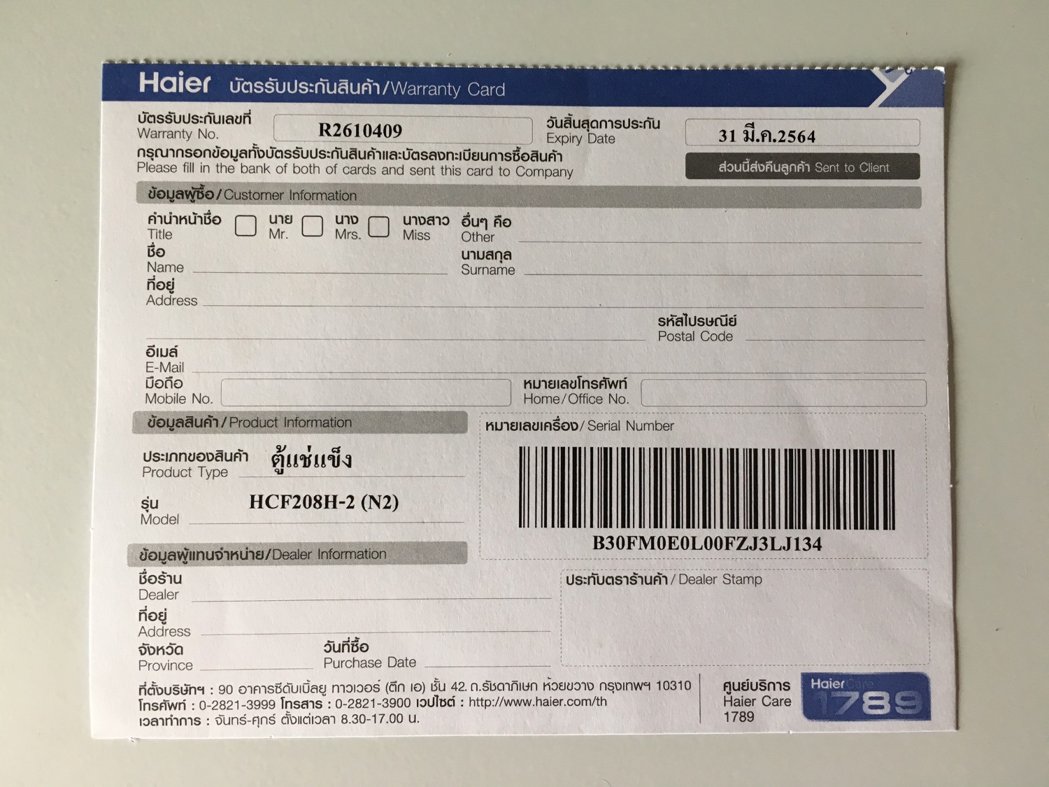 มีประกัน Care+ ของ Haier 3 ปี (เหลือถึง 31 มีนาคม 2564) ประกัน compressor 5 ปี