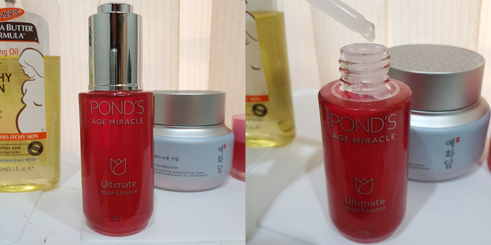 4.ขั้นตอนการลงสกินแคร์ เราจะเริ่มจากการลงเอสเซนส์ก่อนเป็นอันดับแรกเลยค่ะ โดยที่ตัวนี้เราจะเน้นเรื่องของการลดริ้วรอยเลยนะคะ เพราะว่าเราเนี่ยปล่อยให้ผิวเราไม่ได้รับการดูแลมานานพอสมควร แล้วรู้สึกได้ว่าผิวมันไม่เนียนนุ่มเหมือนแต่ก่อน เริ่มมีริ้วรอยผิวหน้าดูไม่สดใส ที่เราใช้ประจำก็จะเป็น Pond’s Age Miracle Ultimate Youth Essence ตัวนี้จะเน้นเรื่องของการลดริ้วรอย ทำให้ผิวตึงกระชับ เราเองจะใช้ในขั้นตอนแรกหลังการล้างหน้าเลยค่ะ จากที่ใช้มาเห็นผลชัดเจนมากเลยว่าผิวละเอียดขึ้น ดูเด้งขึ้น ตรงหน้าแก้มไม่แห้งผากเหมือนแต่ก่อน แล้วรูขุมขนก็เล็กลงด้วยค่ะ เรื่องของกระตรงหน้าแก้มก็ดูจางลงนะคะ ให้ความชุ่มชื้นดี ทาได้ทั้งเช้าและเย็นเลย แนะนำนะคะสำหรับคนที่มีริ้วรอยหรือเริ่มที่จะมีริ้วรอย ตัวนี้บำรุงได้ดีเลยค่ะ ค่อนข้างที่จะมีความเข้มข้น ทาแล้วเห็นผลไว ใช้แล้วแต่งหน้าง่ายขึ้นไม่ตกร่องด้วย