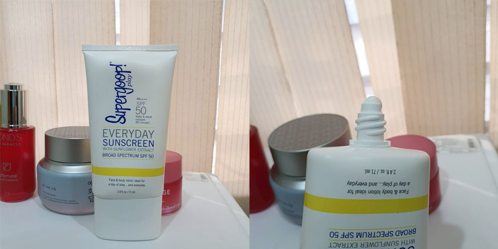 7.ถ้าเป็นในตอนเช้า เราจะล้างหน้า ลงเอสเซนส์พอนด์ส แล้วตามด้วยครีมกันแดดเลยค่ะ บำรุงมาดีแล้ว ห้ามขาดกันแดดเด็ดขาดเลยนะคะ เพื่อเป็นการปกป้องสิ่งที่เราบำรุงไป กันแดดที่เราใช้ก็คือ SUPERGOOP! Everyday Sunscreen Broad Spectrum SPF 50 PA++++ กันแดดตัวนี้จะเป็นเนื้อครีมสีขาว ที่มีความเข้มข้น แต่เกลี่ยลงที่ผิวแล้วก็ค่อนข้างจะบางเบาเลยนะคะ ทาแล้วไม่ออกสีด้วย เพราะฉะนั้นจะไม่ทำให้หน้าวอกแน่นอน หลังจากเซตตัวแล้วจะให้ความสบายผิวค่ะไม่เหนียว ก็สามารถลงแป้ง หรือแต่งหน้าต่อได้เลย โดยไม่ทำให้เครื่องสำอางเป็นคราบ ในวันที่เราไปถ่ายรูปเราทาสองชั้นเลยค่ะ เพราะถ่ายกลางแจ้ง กลางไฟสตู กลัวหน้าไหม้