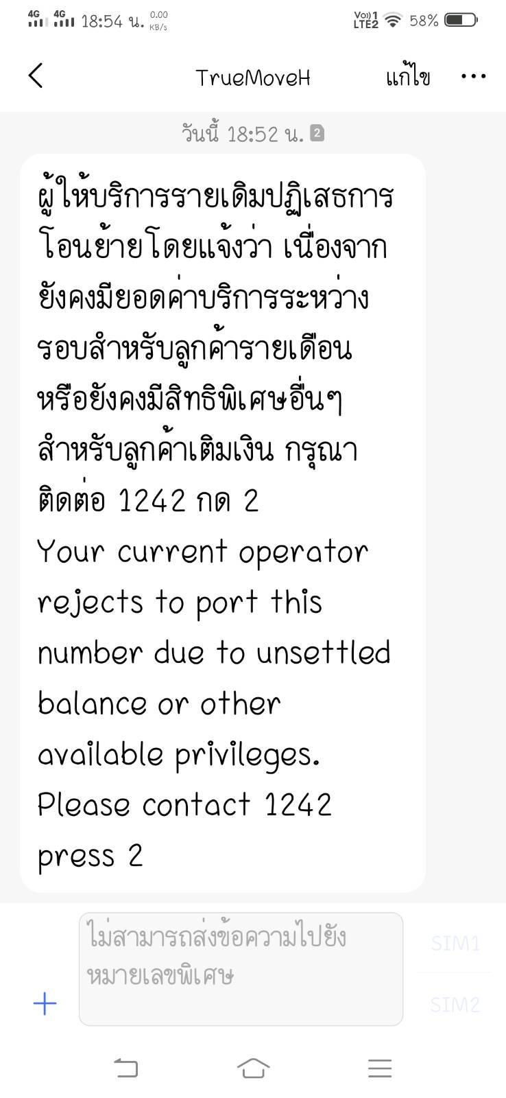 พอดีไปย้ายจาก ais ไป ทรู แต่ไม่สามารถย้ายได้ แล้วมีข้อความแบบนี้มา