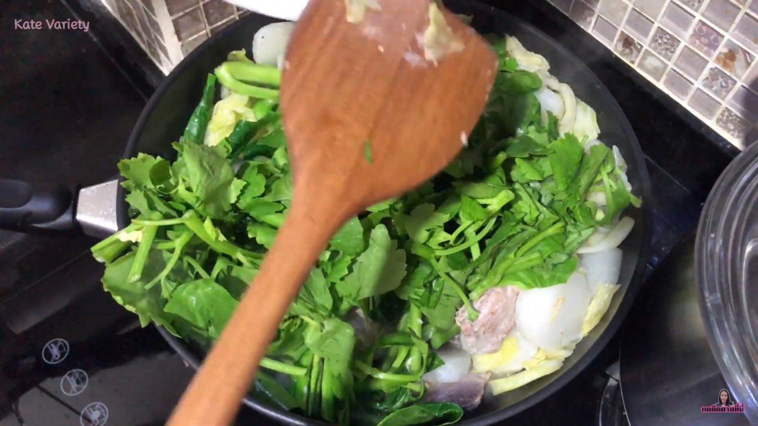 4.เมื่อผักยุบตัวและผัดเข้ากันแล้ว
