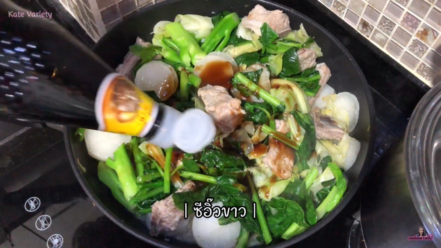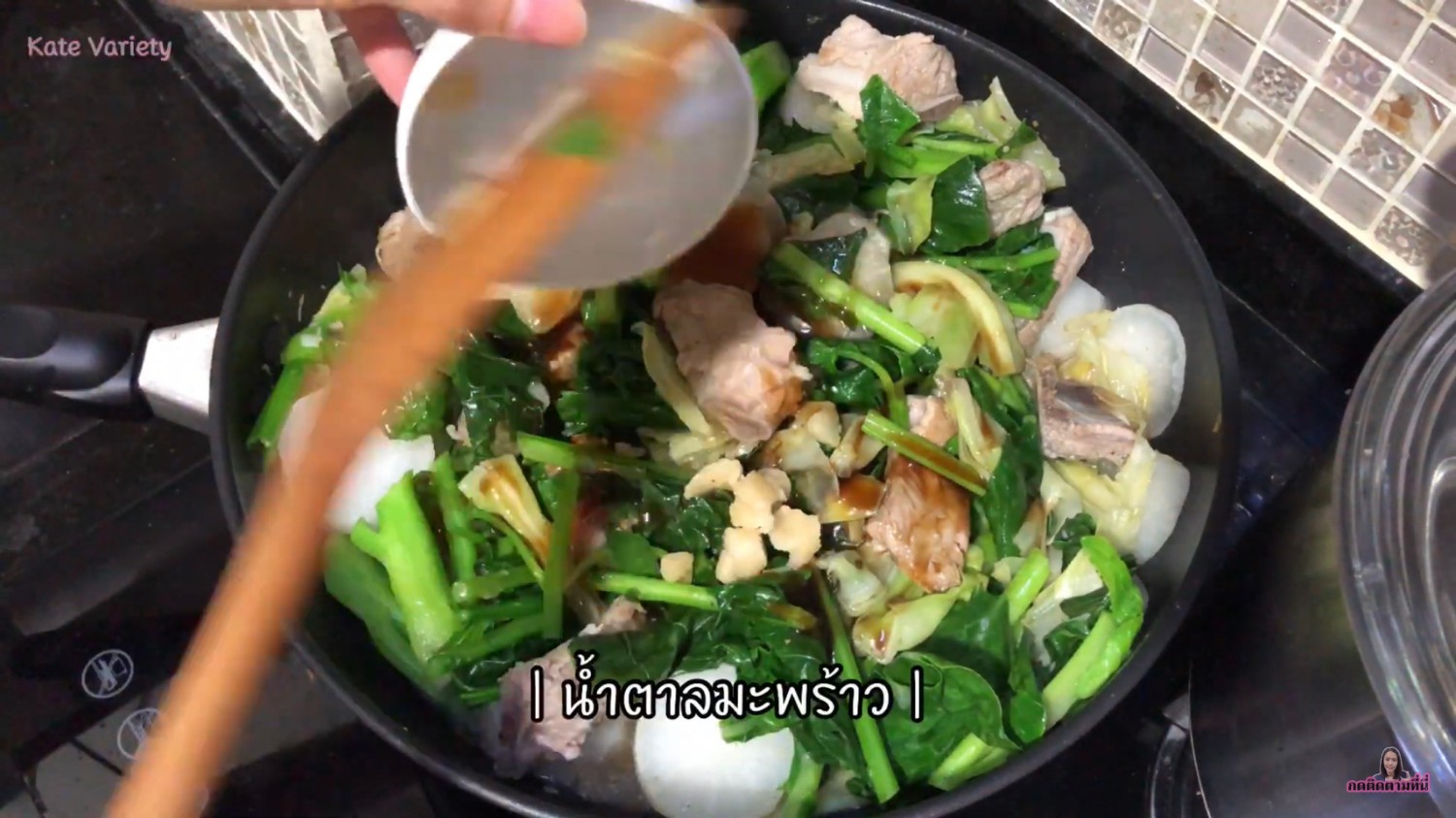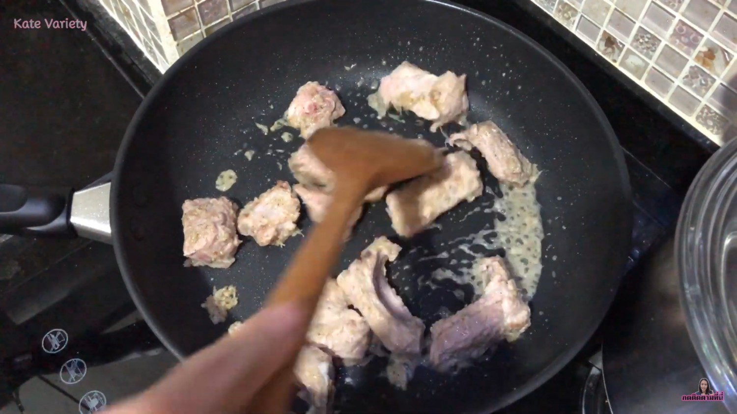 เติมน้ำเปล่าเล็กน้อย ผัดจนซี่โครงหมูพอสุก