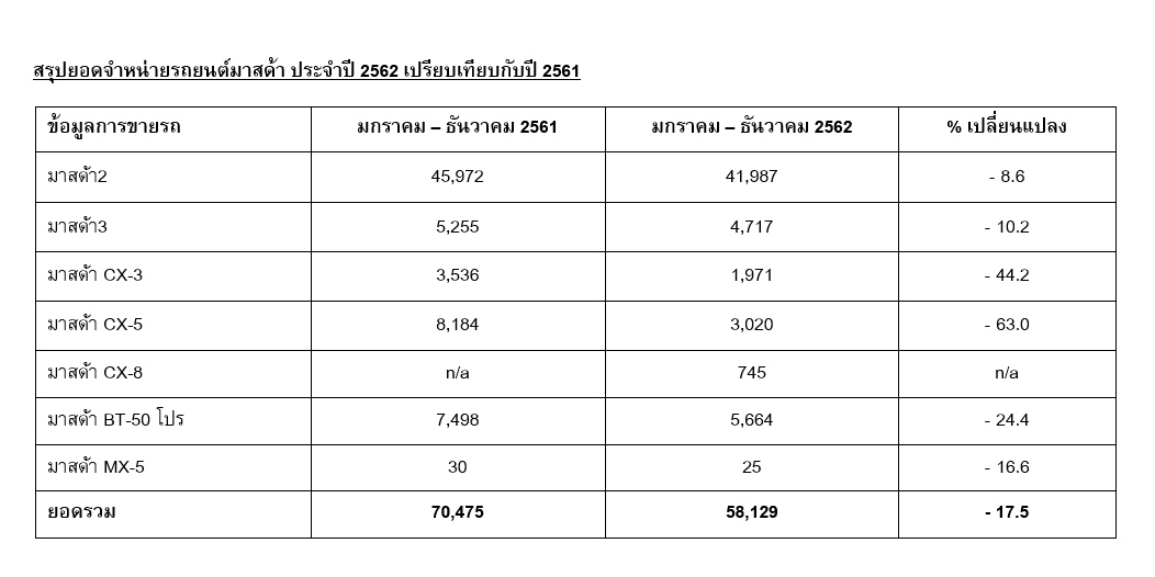 สรุปยอดจำหน่ายรถยนต์มาสด้า ประจำปี 2562 เปรียบเทียบกับปี 2561