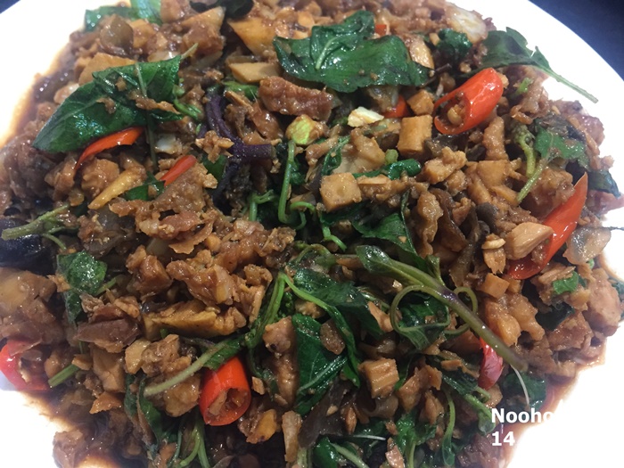 ผัดกะเพราวันนี้ นำเอาไก่ย่าง หมูทอด ปลาทอด ที่เหลือจากวันก่อนนำมาสับ ผัดใส่กะเพรา จร้า