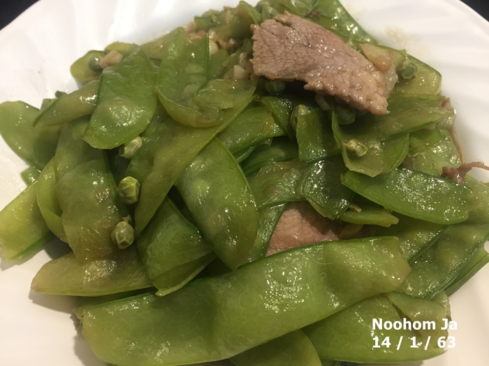 ถัวลันเตา ถั่วน้อย ที่ยังไม่ได้ดัดแปลงพันธุกรรม เป้นถั่วหวาน เอามาผัดกับหมู