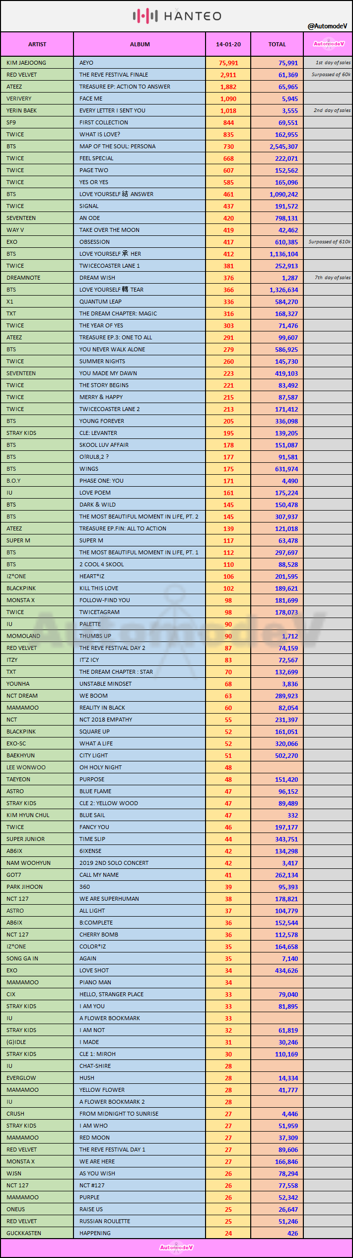 ยอดซื้ออัลบั้มจากชาร์ต HANTEO 14 มกราคม 2563 + 2020 1st DAY