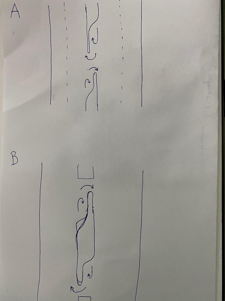 ส่วนรูป B นี้ระยะห่างที่กลับรถทั้ง 2 ฝั่งห่างกันประมาณ 1 kmแต่ในรูปดูเหมือนสั้นเพราะผมวาดไม่ดีครับ
