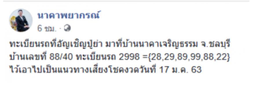 เมื่อวันที่ 16 เพจดัง นาคาพยากรณ์ ได้โพสต์ข้อความให้เลขเด็ดระบุว่า ทะเบียนรถที่อัญเชิญปู่ย่า มาที่บ้านนาคาเจริญธรรม จ ชลบุรี บ้านเลขที่ 88ทับ40 ทะเบียนรถ 2998 = 28 29 89 99 88 22 ไว้เอาไปเป็นแนวทาง วันที่ 17 มค 63