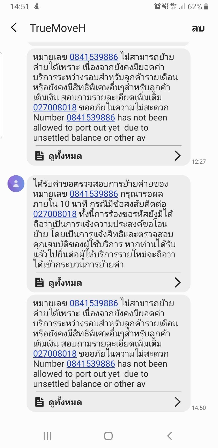 จากการแจ้งย้ายเครือค่าย จาก *151* ซึ่งจ่ายค่าโทรศัพท์ล่าสุดแล้ว
