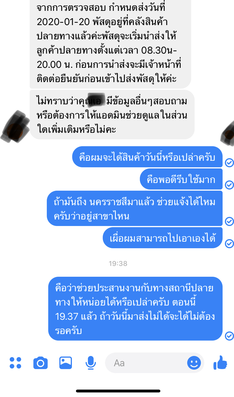 - ผมก็ โอเค อีกไม่นานหรอกมั้ง คงมา จนบ่าย 1 ผมจึงต้องโทรไปคอลเซ็นเตอร์อีกรอบแล้วถามว่า สินค้านี้ถึงไหนแล้ว ตอบเหมือนเดิมคือ กำหนดส่งวันนี้ รอติดต่อ แต่ได้คำตอบใหม่มาคือ ไม่เกิน 2 ทุ่มนะคะ