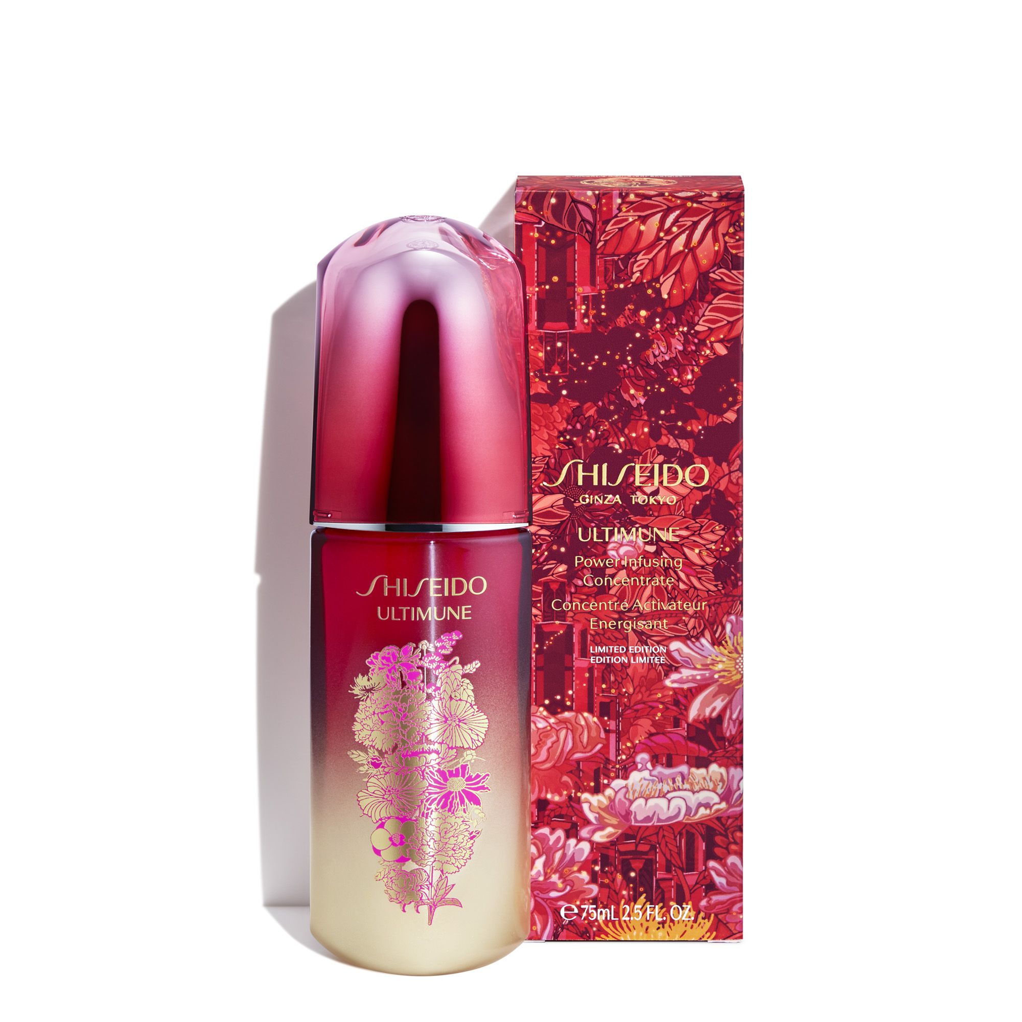 Shiseido Ultimune Power Infusing Concentrate เฟิร์สเซรั่มยอดนิยมของแบรนด์ชิเซโด้ ในเทศกาลตรุษจีนนี้ ได้มีการดีไซน์แพ็กเกจจิ้งด้วยภาพลวดลายของหมู่มวลดอกไม้ในสไตล์อินาบะ บนขวดสีแดงไล่เฉดทองสุดหรูเพื่อสื่อถึงช่วงเวลาแห่งการเฉลิมฉลอง เฟิร์สเซรั่ม Shiseido Ultimune โดดเด่นด้วยคุณสมบัติปกป้องผิว ImuGeneration Technology™ พร้อมคุณค่าการบำรุงจากเห็ดเรอิชิ และพฤกษาสกัดนานาชนิด จึงช่วยทั้งปกป้องและฟื้นบำรุงผิวได้อย่างเต็มประสิทธิภาพ เพื่อเสริมปราการให้ผิวดูสวย สดใส แลดูสุขภาพดีตลอดเวลา