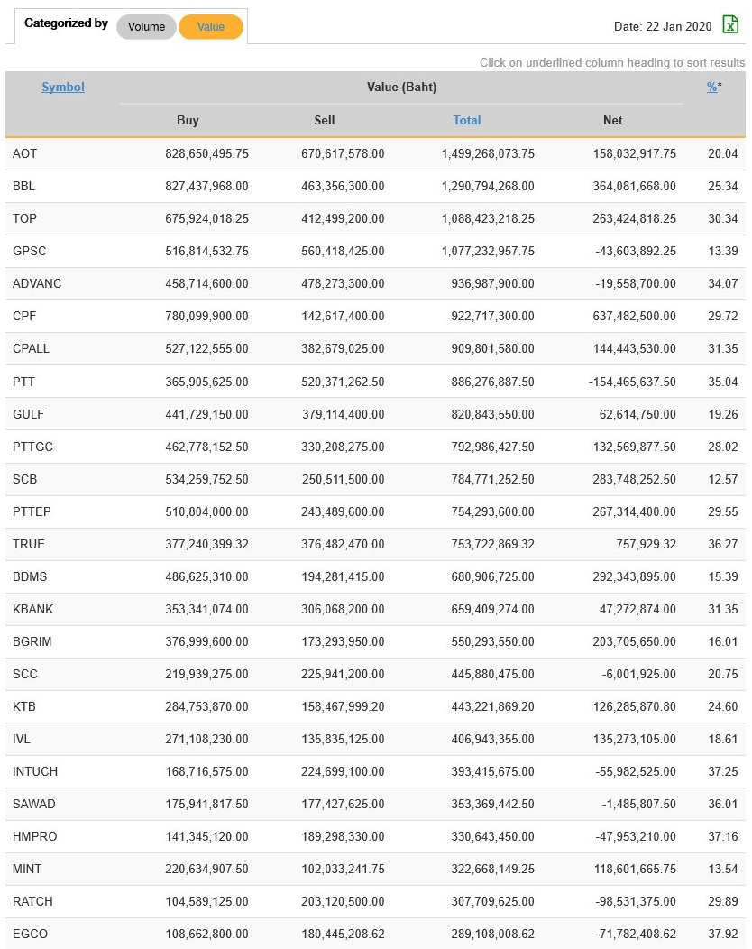 นักลงทุนต่างชาติ NVDR ซื้อ-ขาย มูลค่าสูงสุด 25 อันดับ 22/01/63