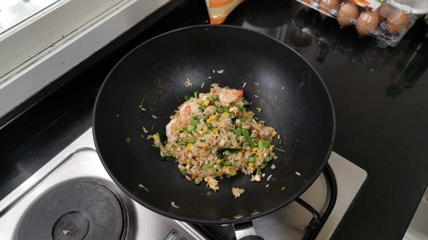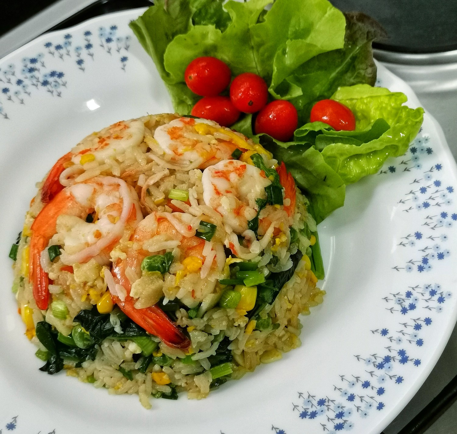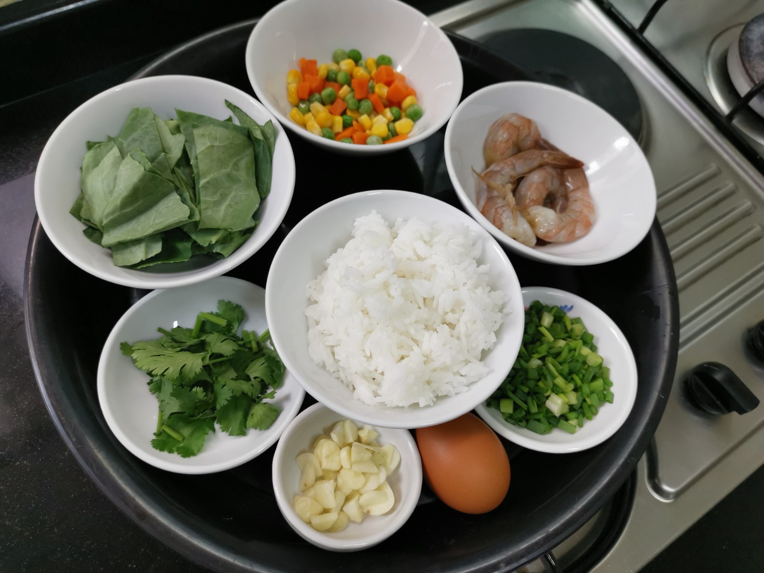 กุ้งขาว /ข้าวสวย /ไข่ไก่ /คะน้า /ผักรวมแช่แข็ง (แครอท, ข้าวโพด, ถั่วลันเตา) /ต้นหอมผักชีซอย, กระเทียม