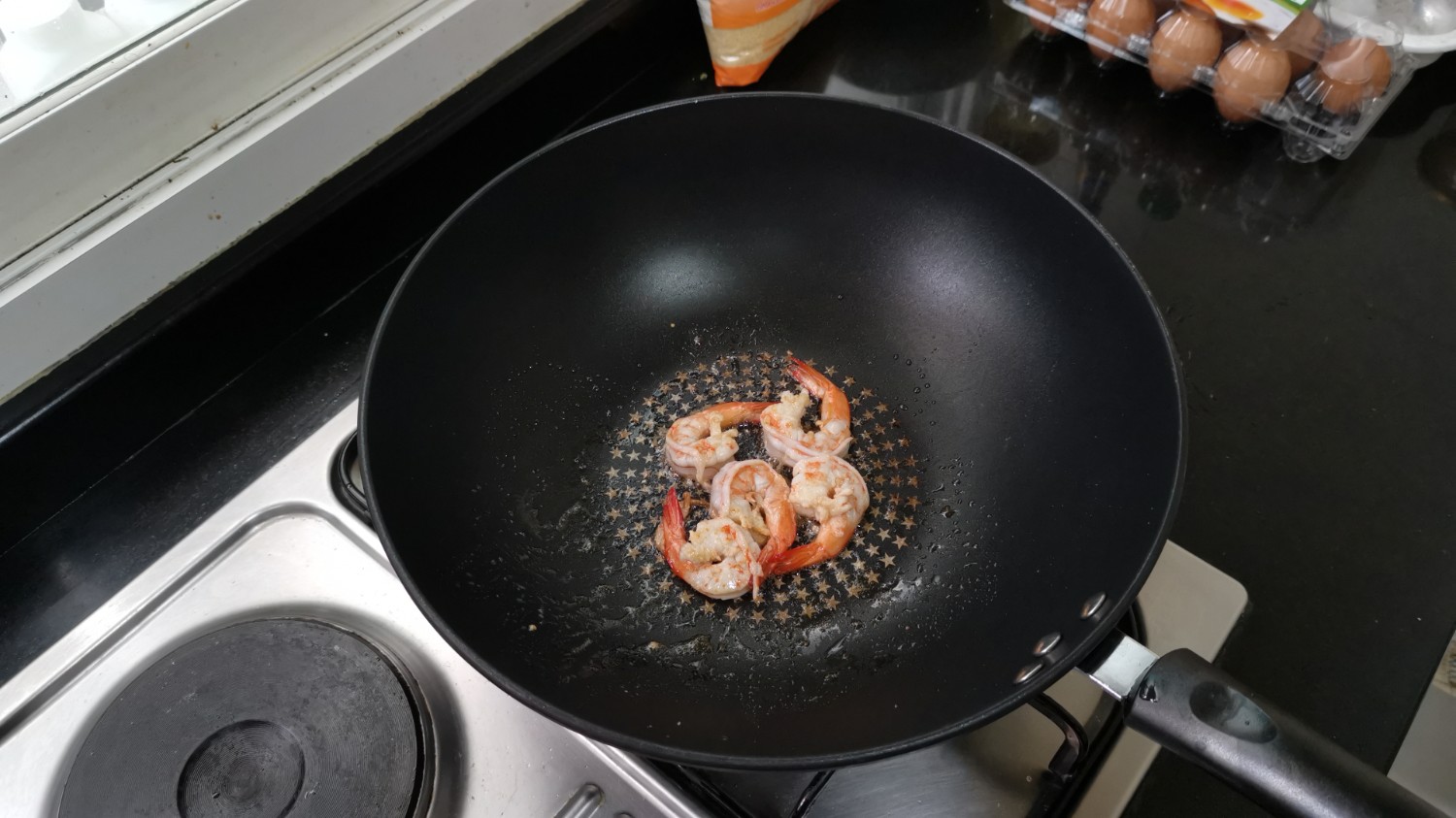 1. ตั้งกระทะให้ร้อน ใส่น้ำมัน แล้วนำกุ้งลงไปผัดให้สุก และตักขึ้น