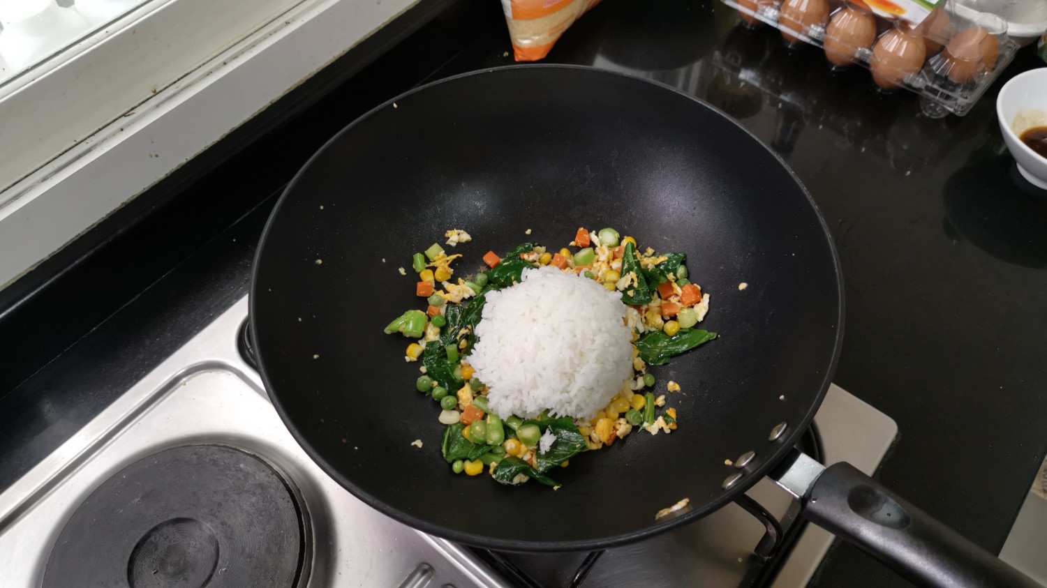 3. ใส่ผักรวมและผักคะน้า แล้วผัดต่อไปสักครู่ จากนั้นใส่ข้าวสวยลงไป